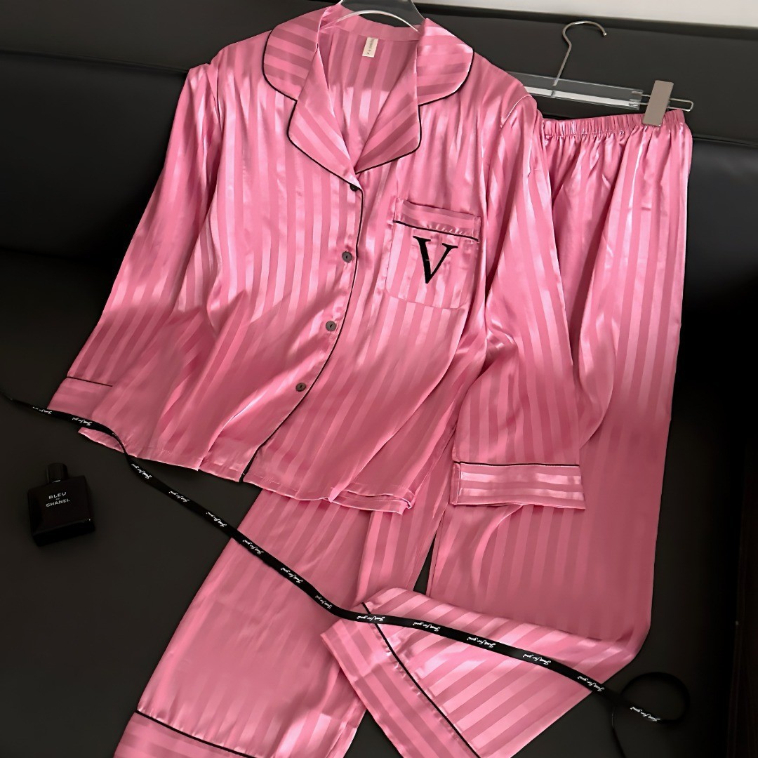 跨境V女士新 冰丝丝滑缎面刺绣条纹长袖长裤睡衣套装小红书抖音款