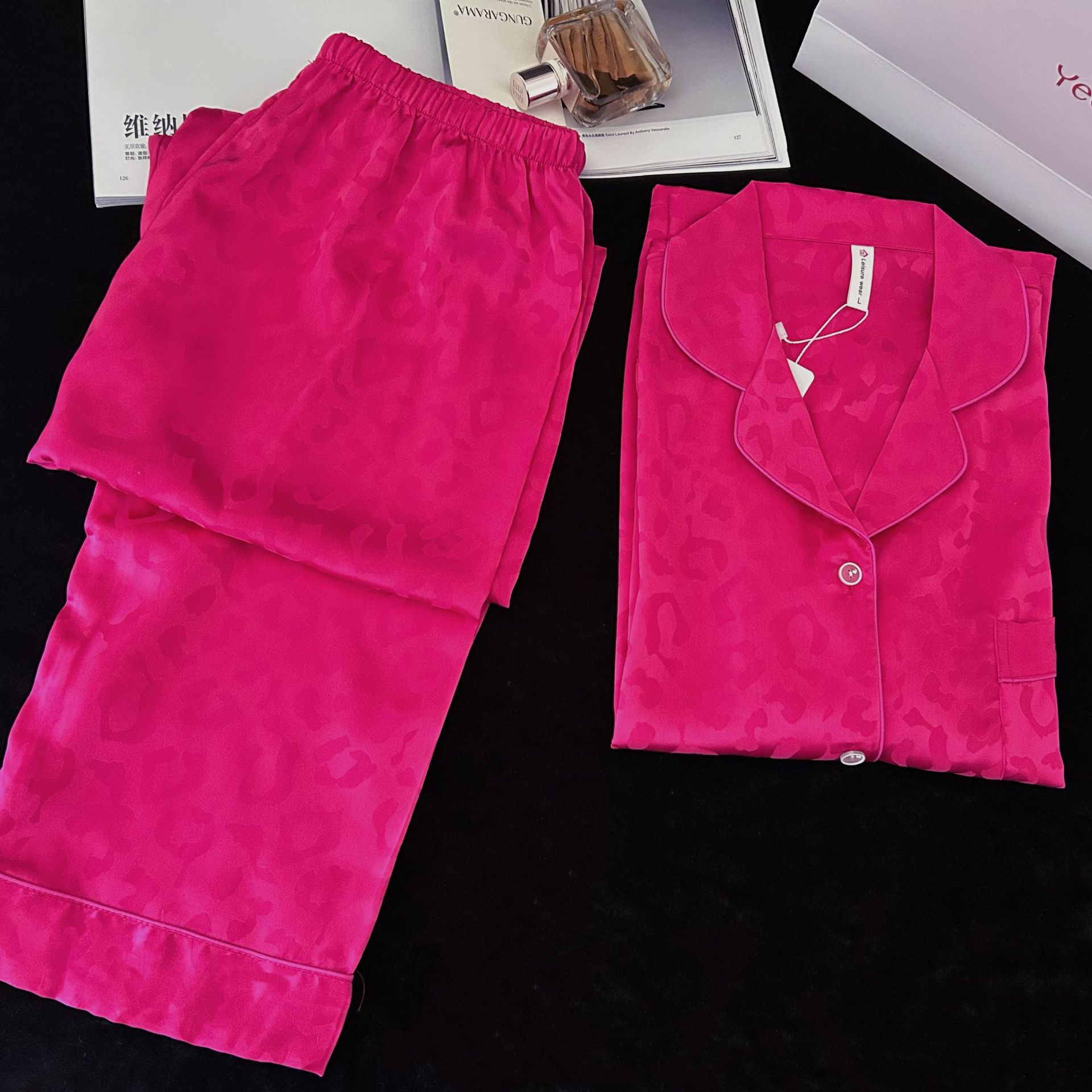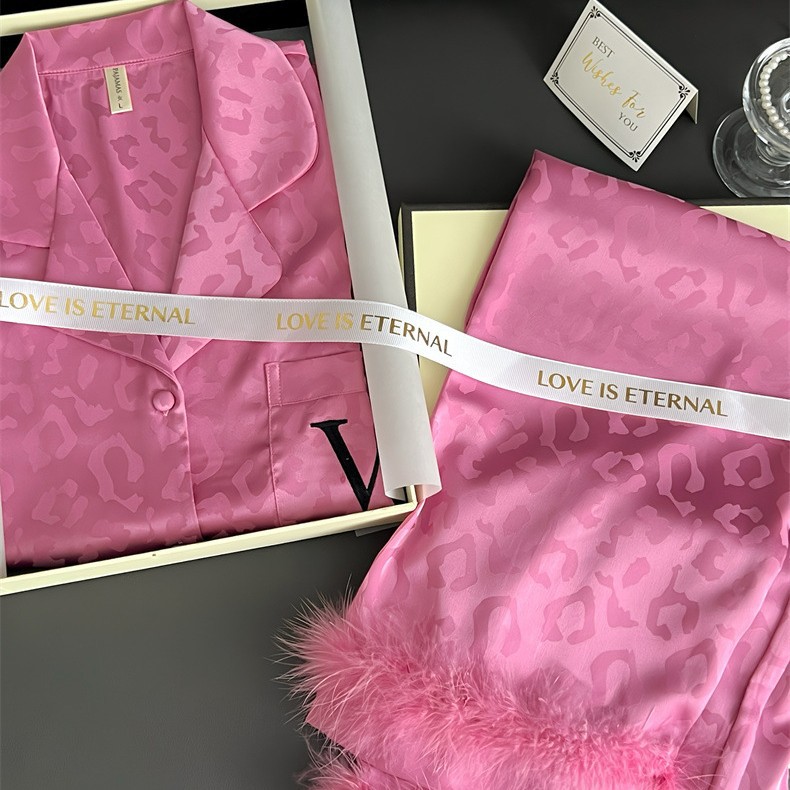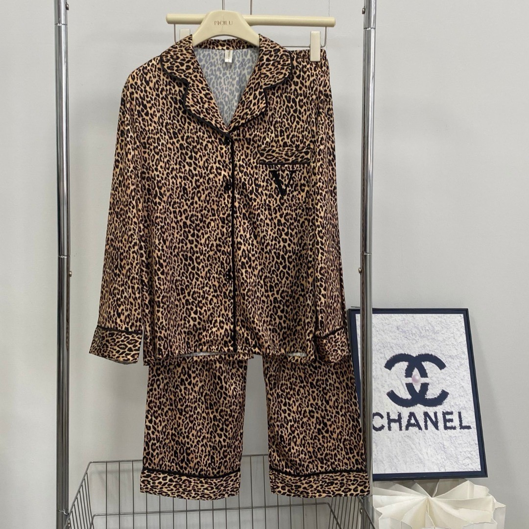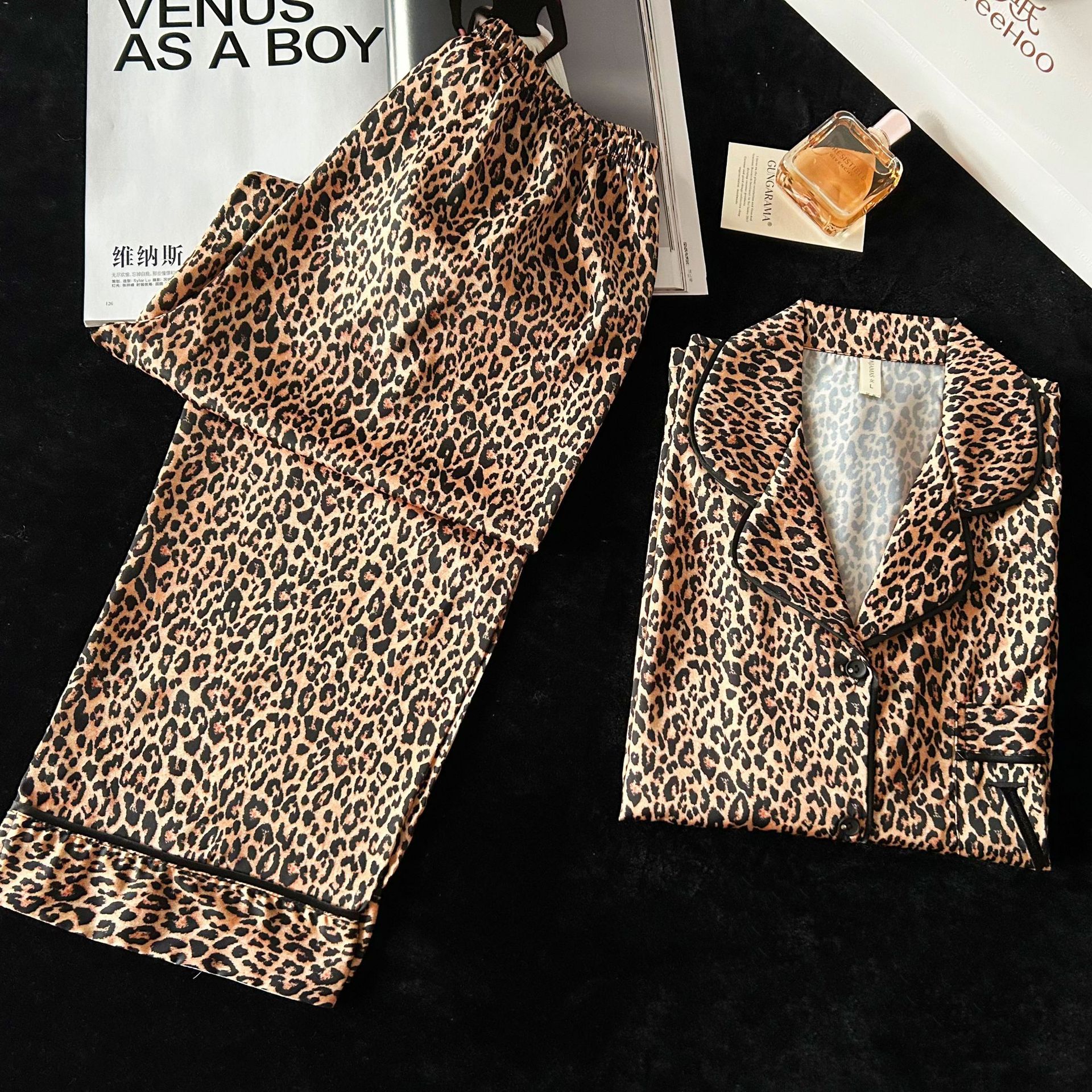 2026新款睡衣跨境外贸V家豹纹冰丝睡衣女长袖长裤套装外穿家居服