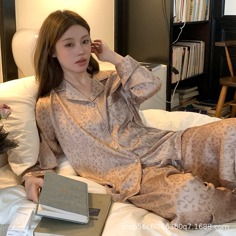 冰丝睡衣豹纹睡衣女高级感长袖长裤套装小红书同款家居服跨境外贸