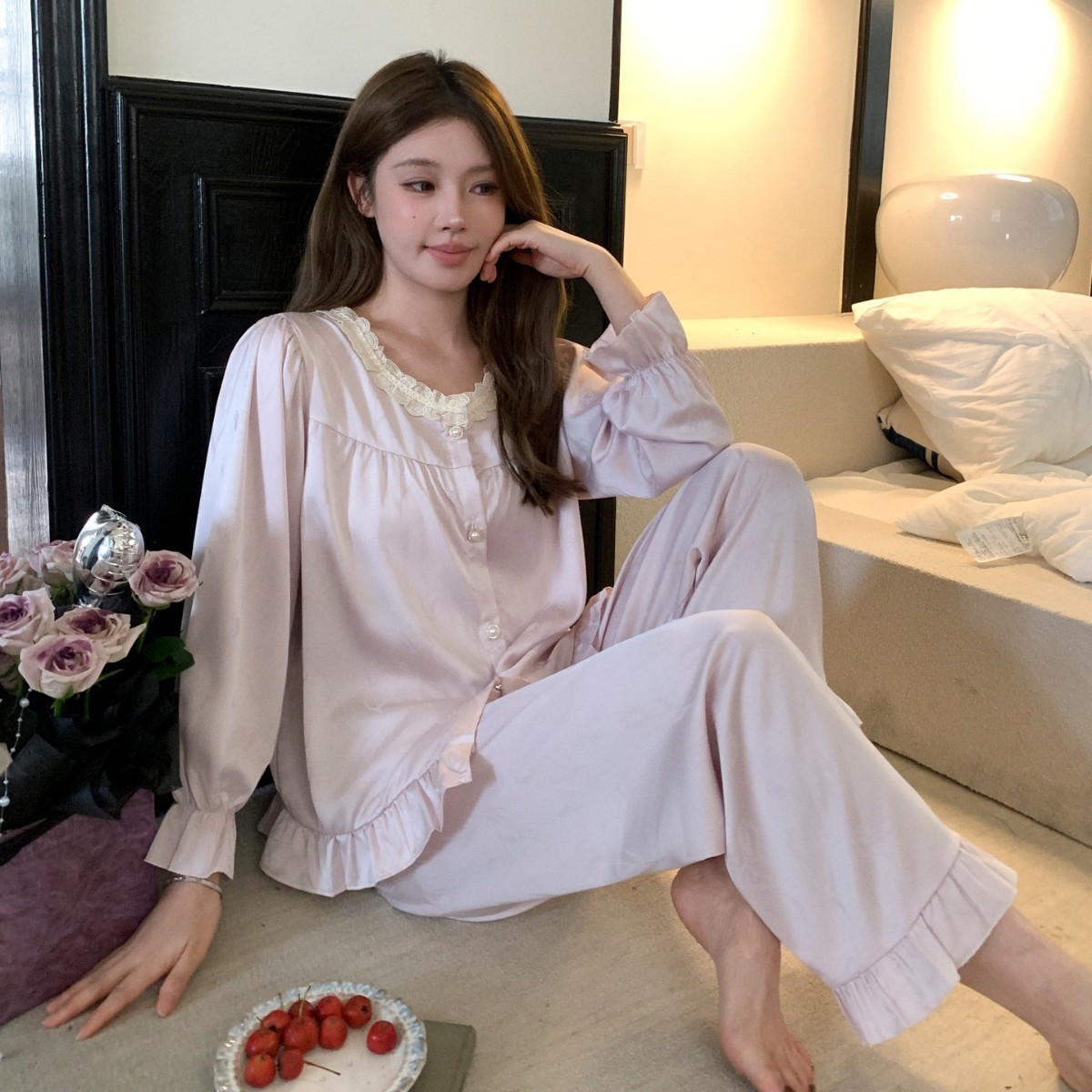2026睡衣女新款柔光缎面长袖长裤套装蕾丝袖口宫廷风可外穿家居服