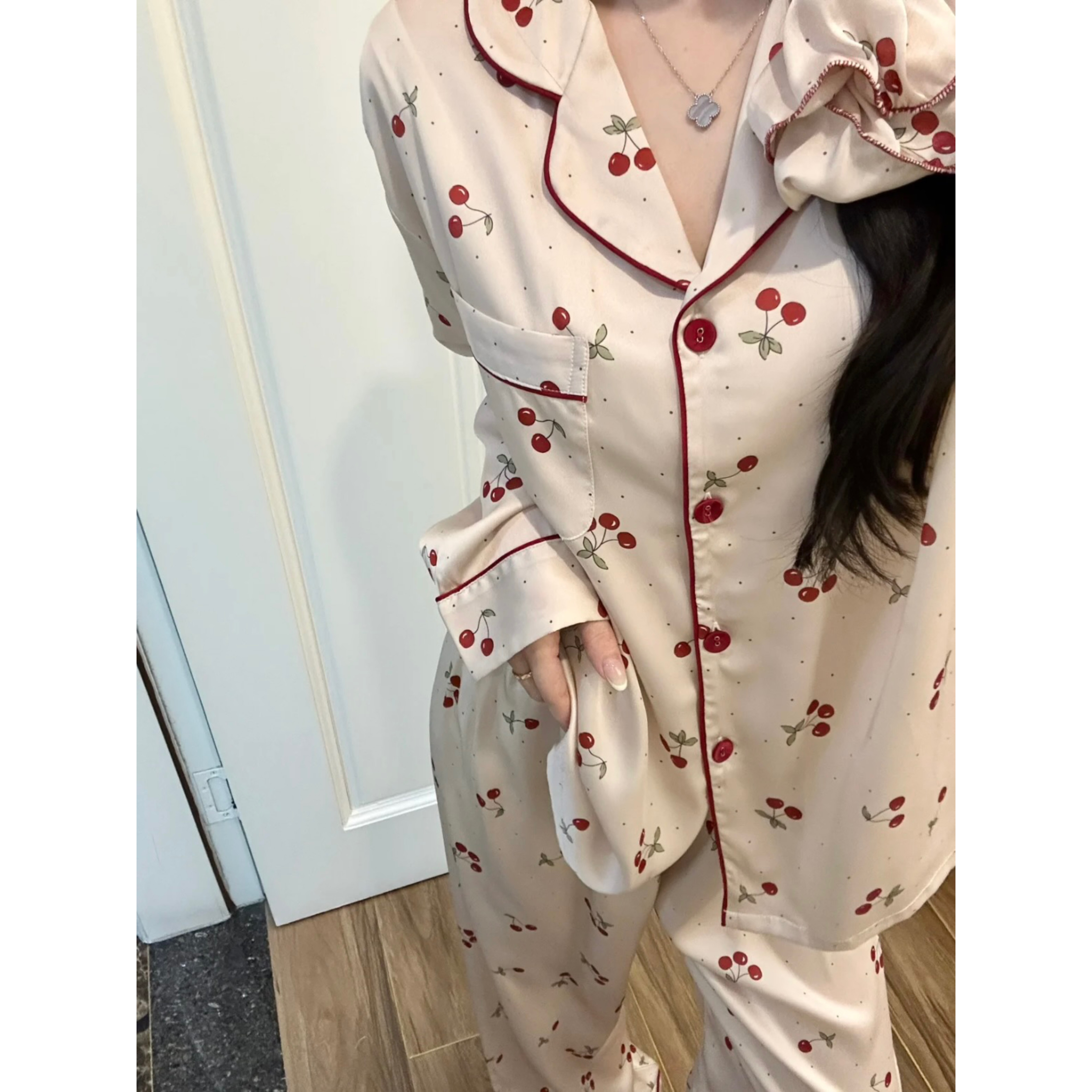 2026跨境白鹿同款樱桃双层色织纱布纯棉樱桃睡衣女简约翻领家居服