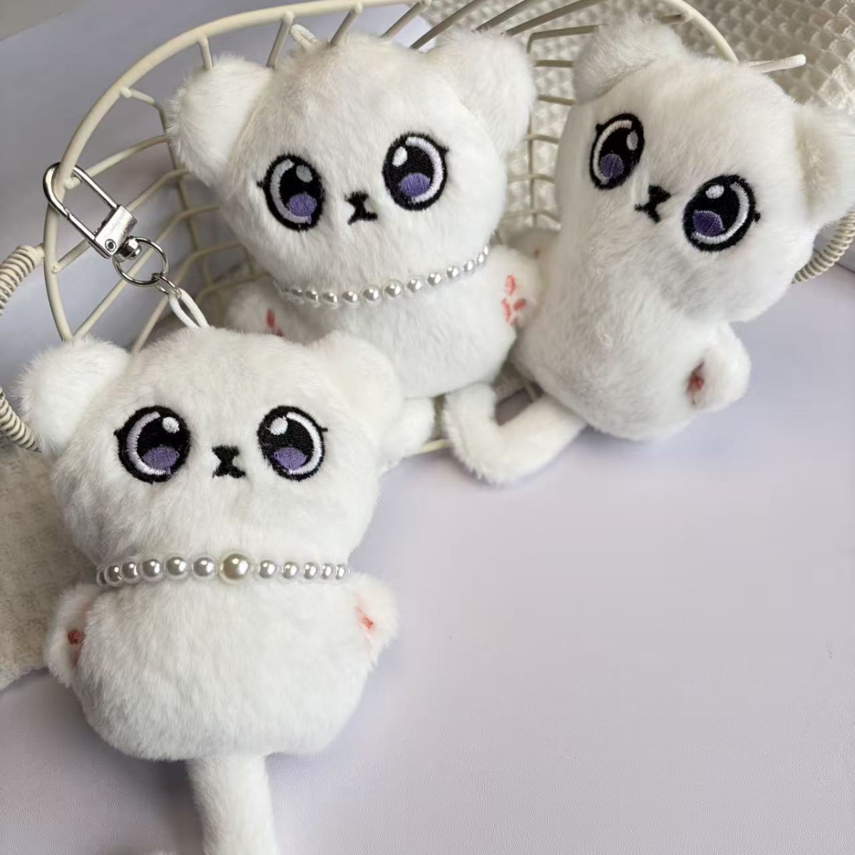 可换装白色斑点猫毛绒挂件 挂饰 配饰 配银色链条钥匙扣