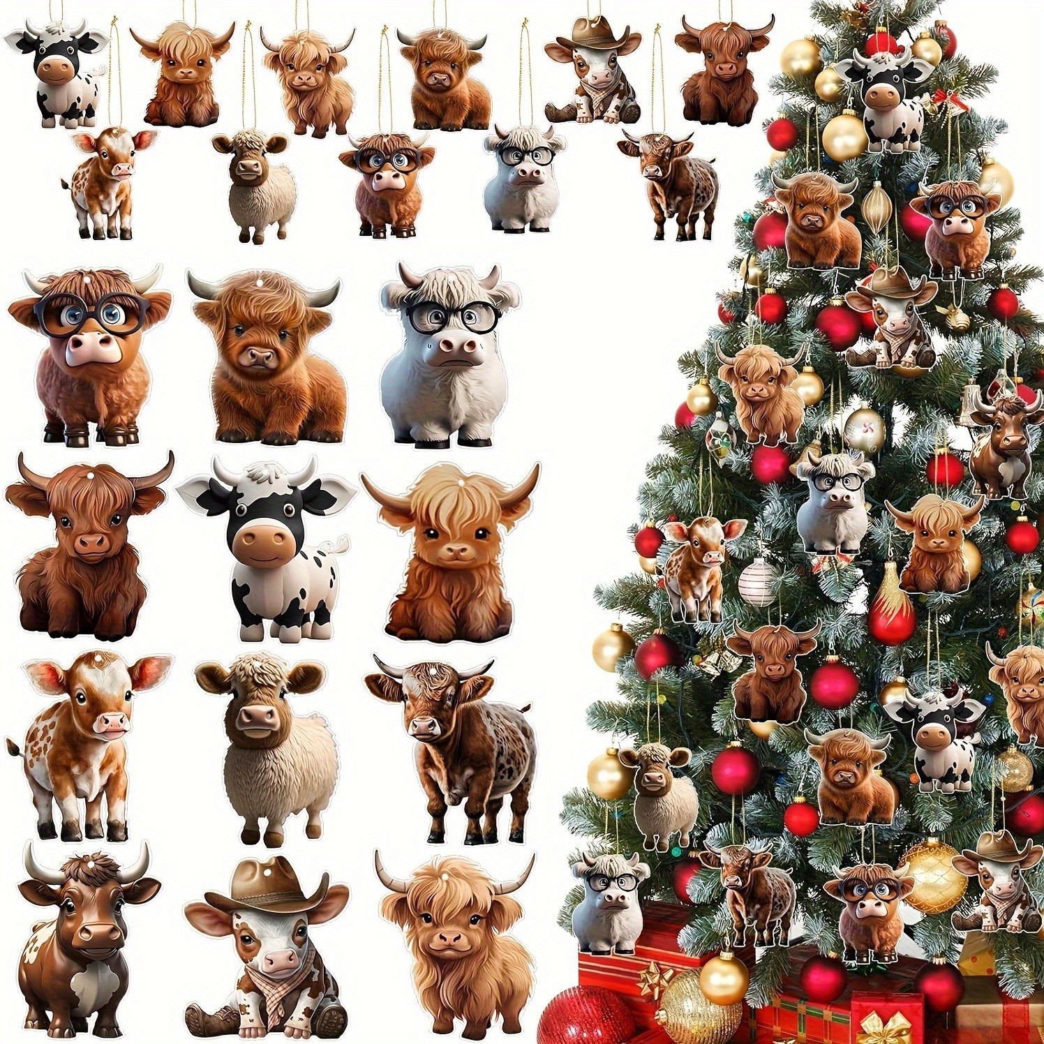 36件件创意圣诞树奶牛可爱木质高地牛木制悬挂装饰品批发