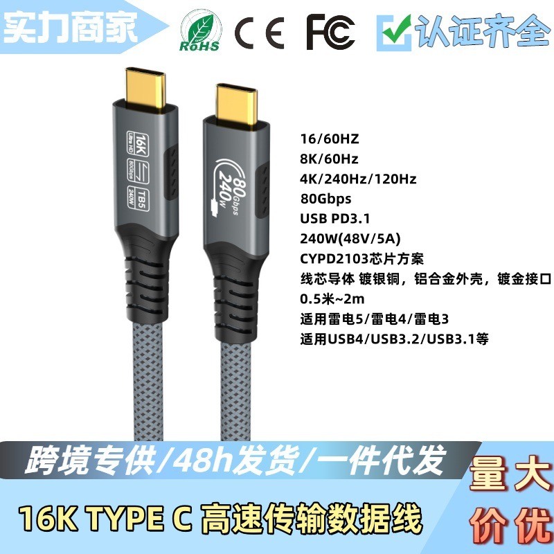 16K Type-c USB4.0 240W 80GB雷电5双协议快充数据线PD3.1传输线