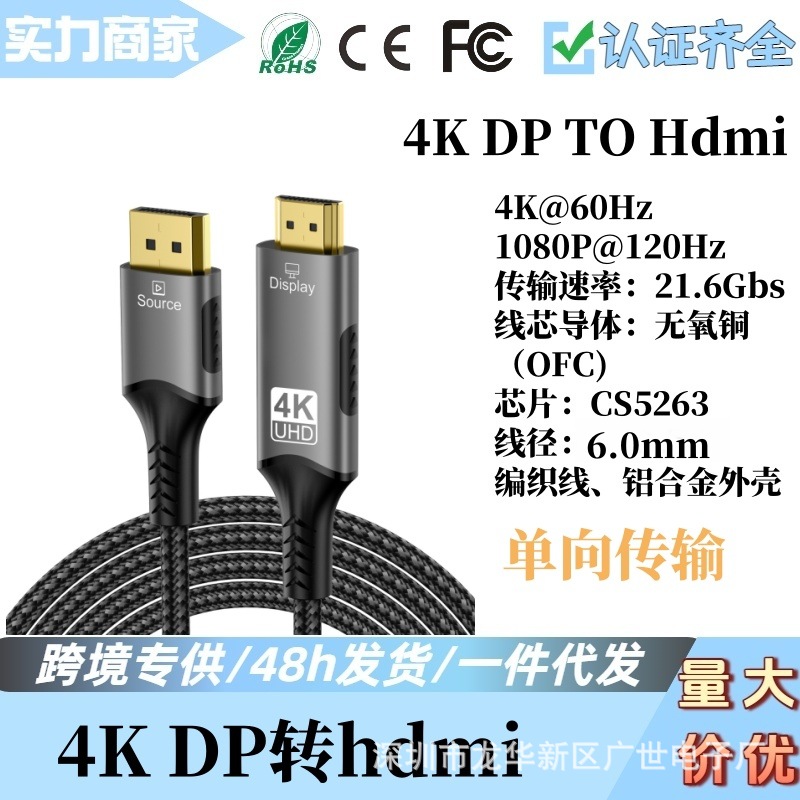 4KDP公转HDMI公单向转换线,DisplayPort转高清4K60高速传输