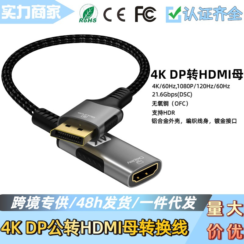 4KDP公转HDMI母单向转换线,DisplayPort转高清4K60高速传输