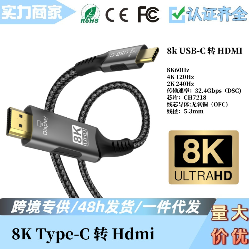 8K60HZ Type-C公单向转HDMI转换线数据线转接线4K适用电脑手机ipa