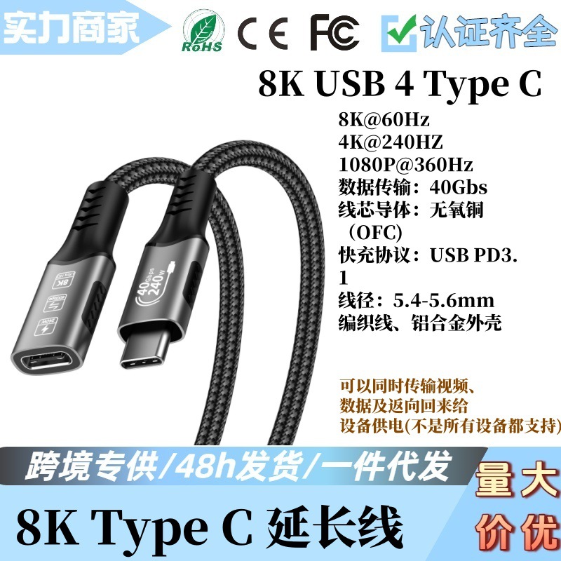 Type-c 公转母高速延长 USB4.0PD240W8K电脑加长数据线适用雷电4
