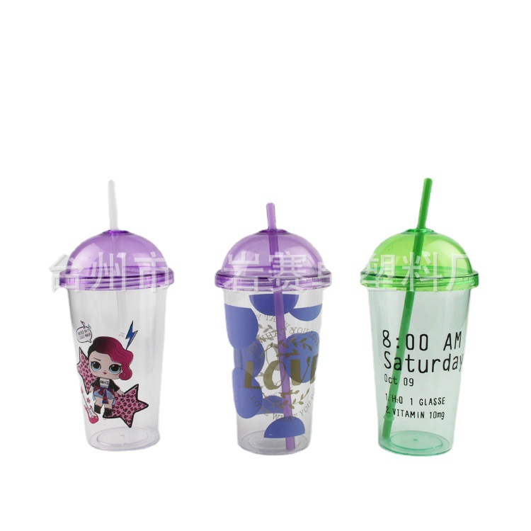 供应各类款式450ml塑料水杯单层圆盖吸管杯卡通印花吸管杯