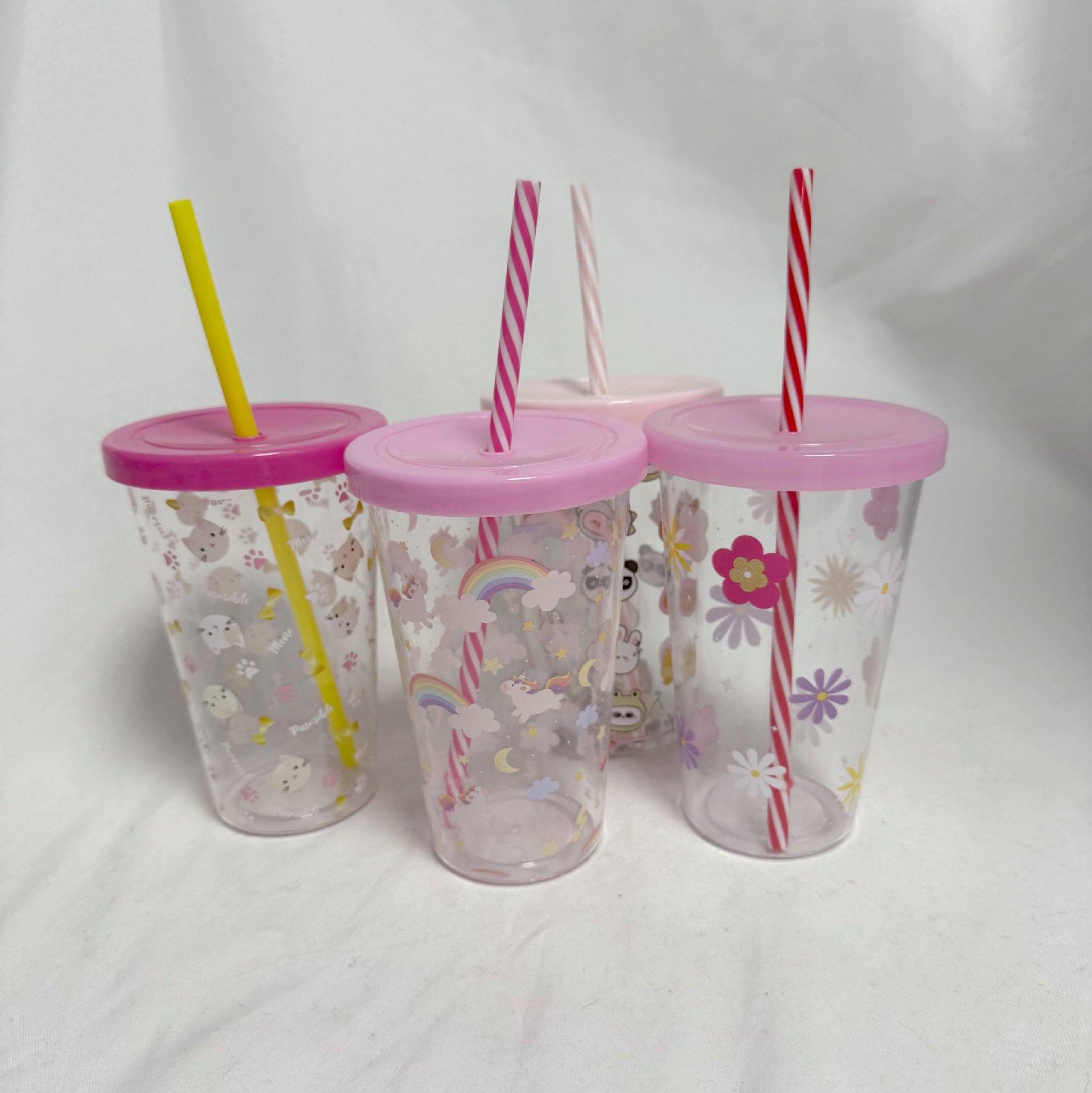 450ml卡通图案PS双层饮料杯塑料果汁杯高身吸管杯直筒杯可印花