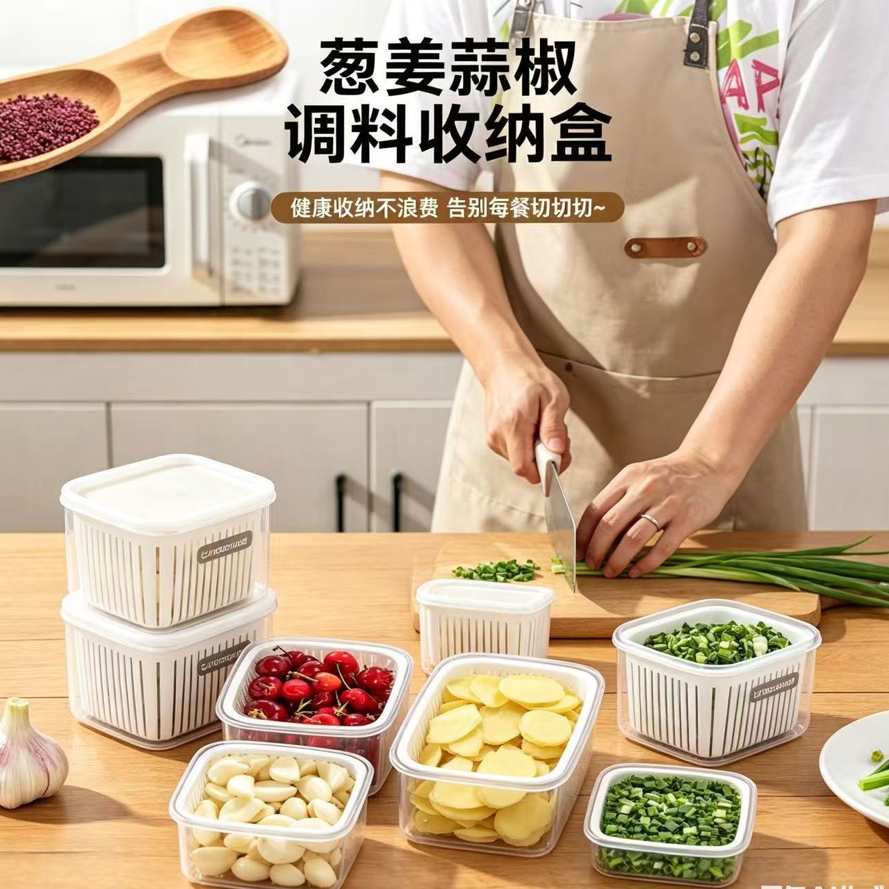日式厨房备菜保鲜收纳盒 家用葱姜蒜辣椒配料储物盒 可沥水防串味