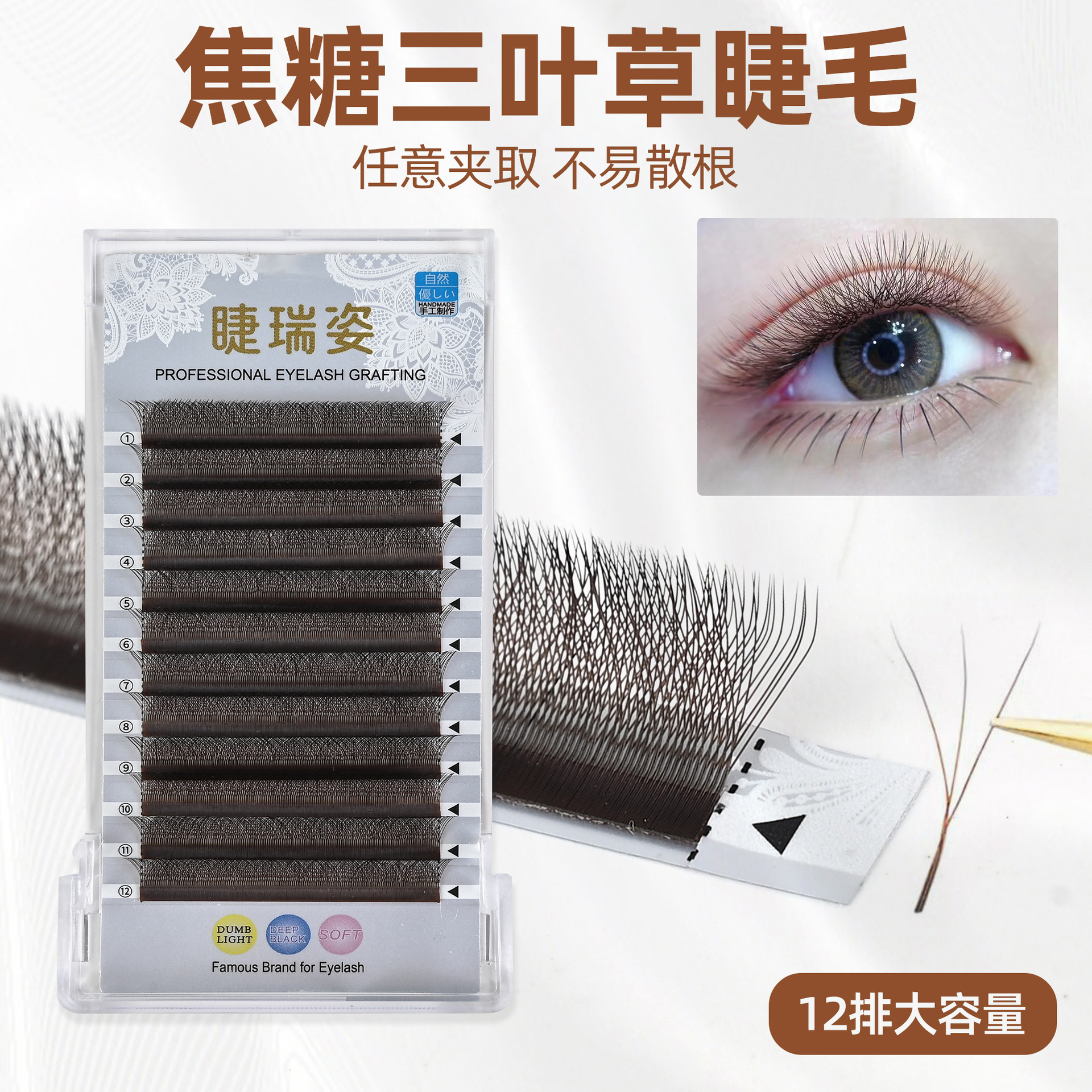 美睫店欧美假睫毛自然浓密睫毛卷翘柔软密排0.05焦糖三叶草嫁接睫