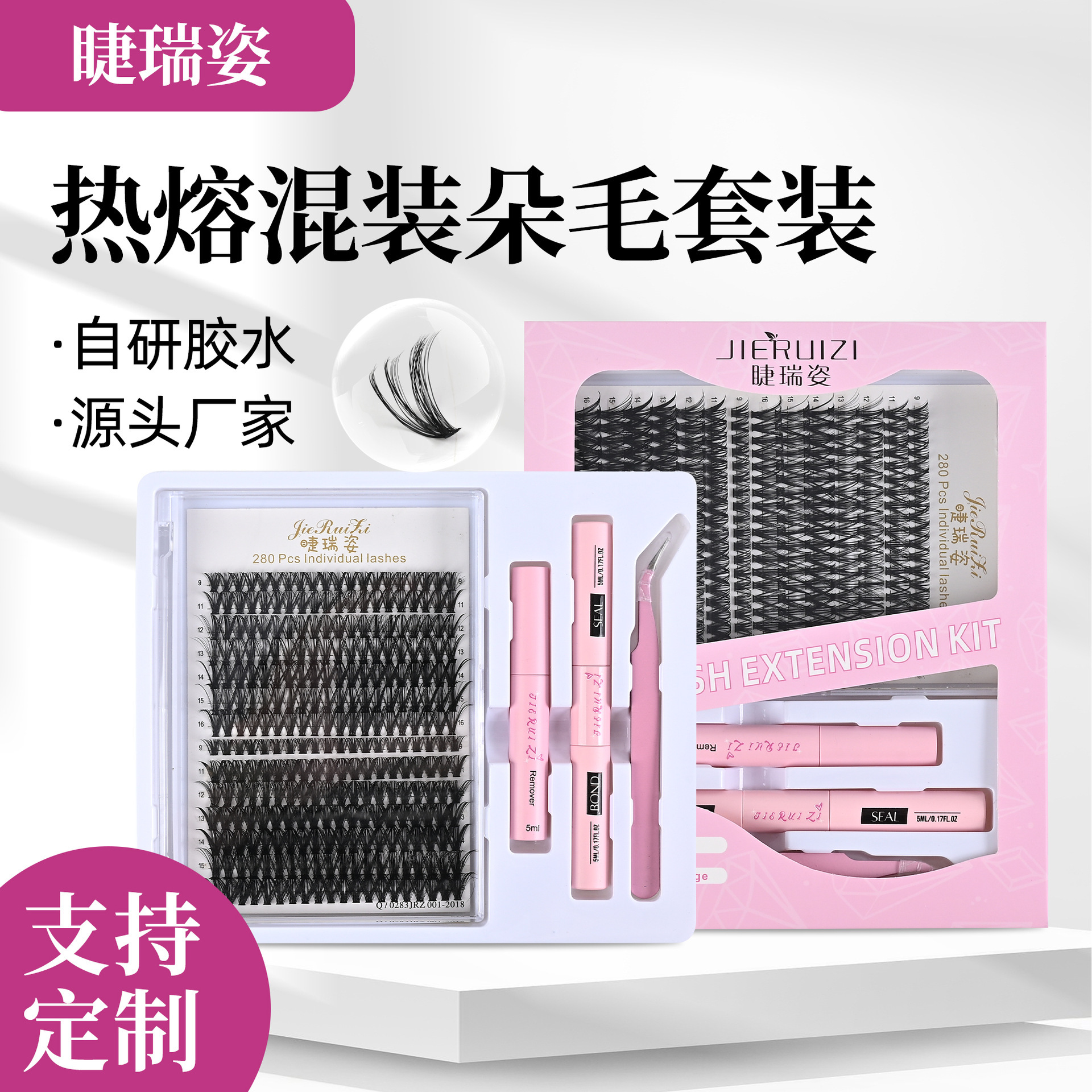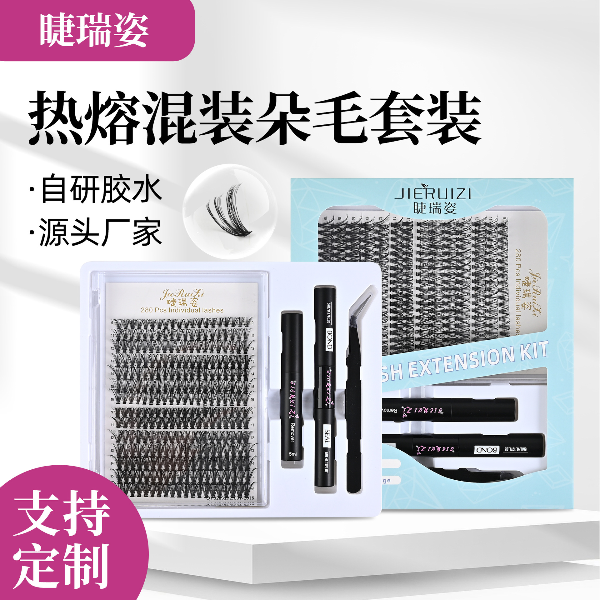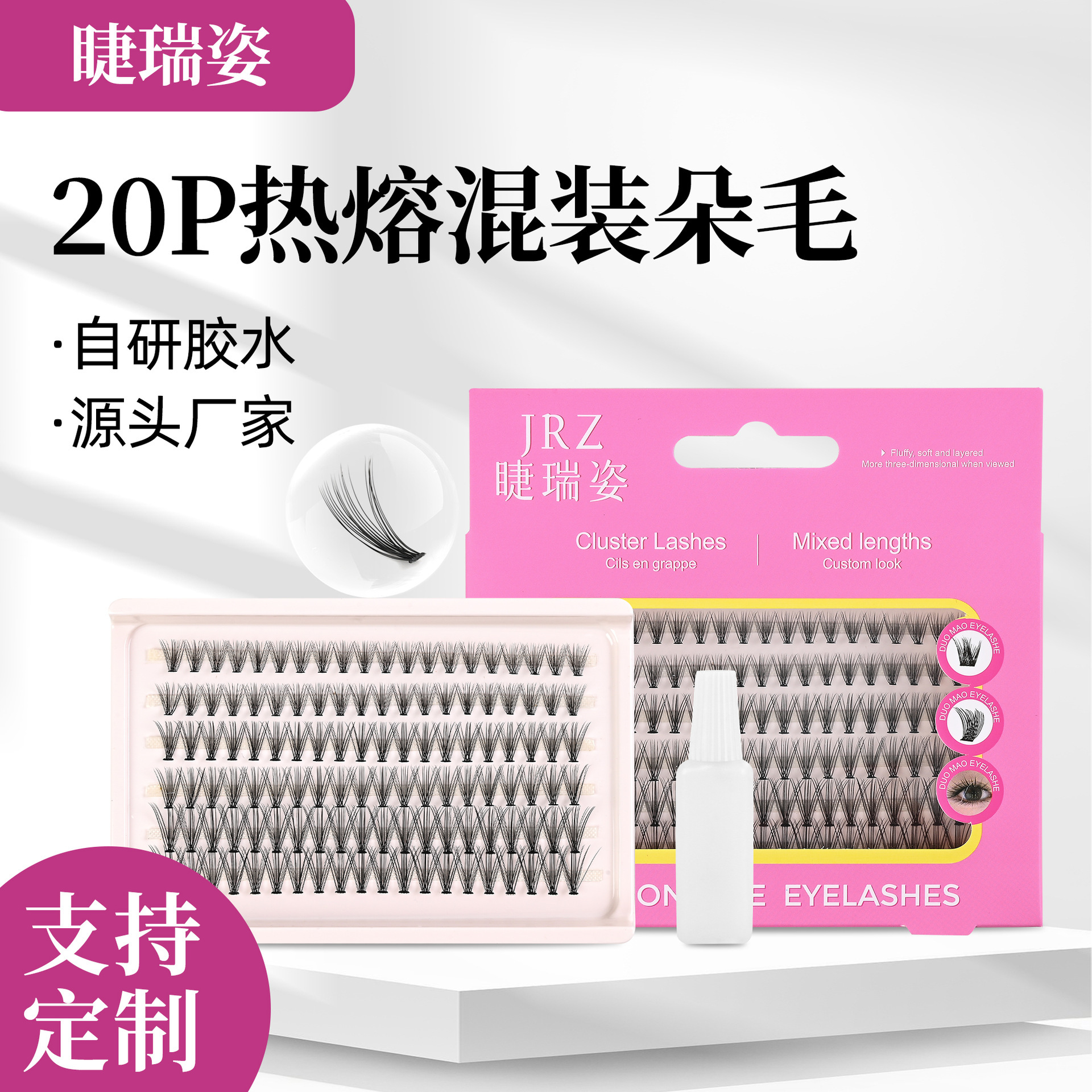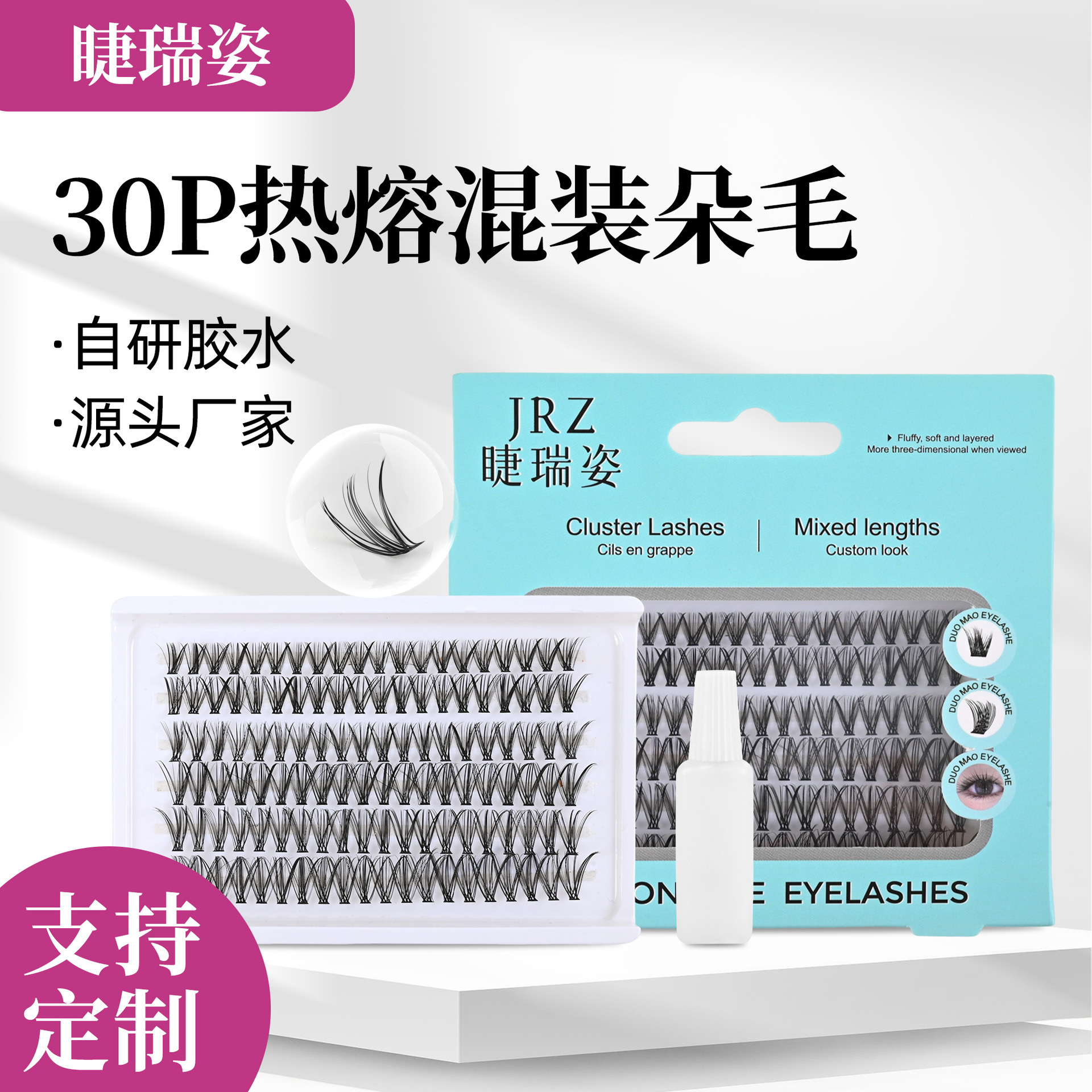 跨境热销朵毛分段假睫毛热熔混装朵毛套装双头胶大容量单簇假睫毛