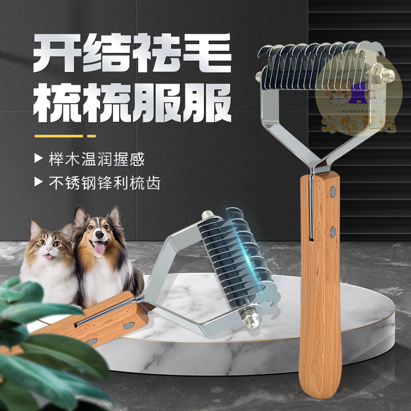 跨境宠物开结梳 猫狗打结双面开结梳木柄猫梳子不锈钢去浮毛梳毛