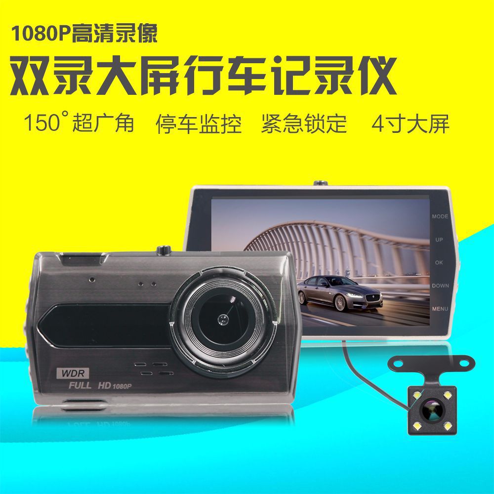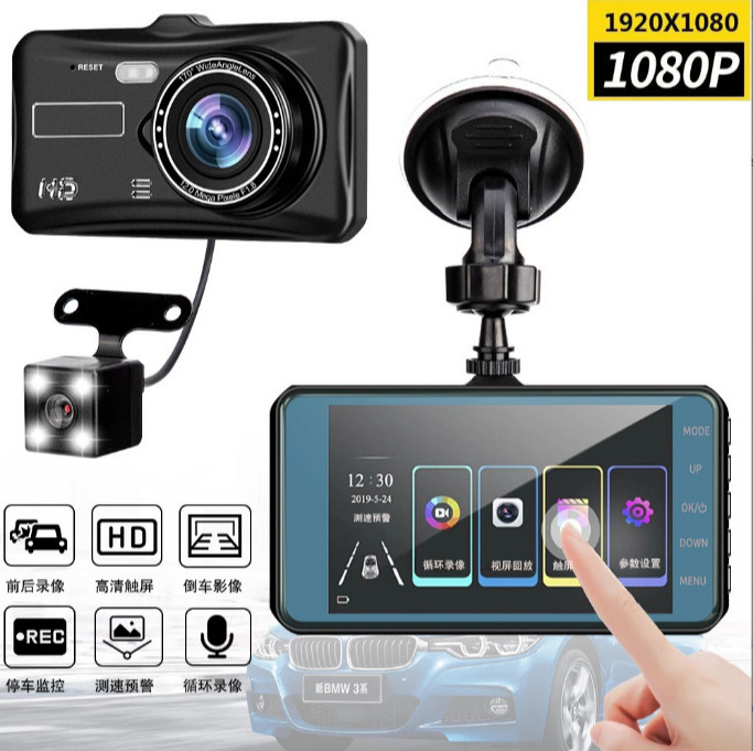 跨境新款行车记录仪高清夜视1080P双镜4寸触摸屏停车监控