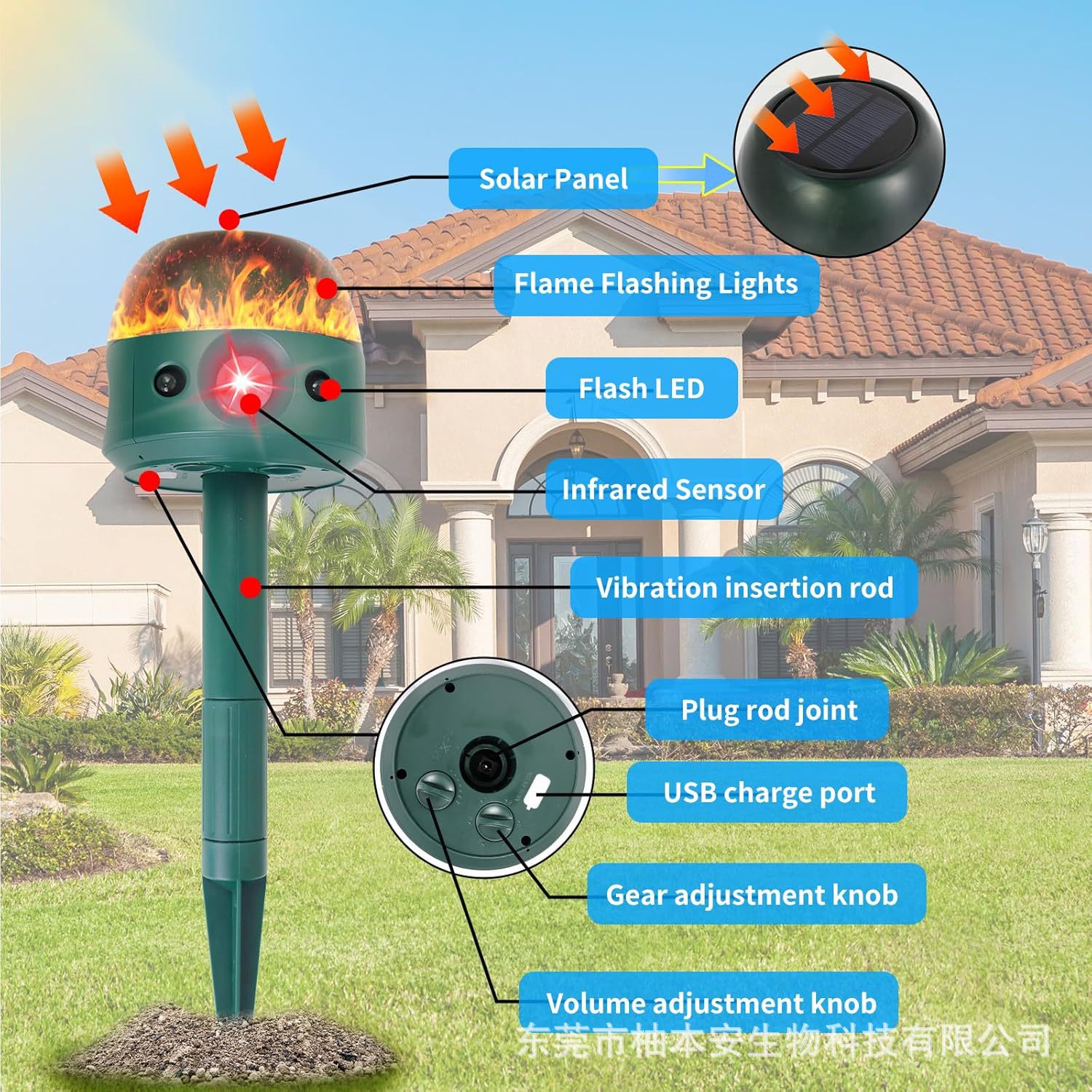 亚马逊热销太阳能超声波动物驱赶器四面火焰灯设计驱鼠器驱鸟器