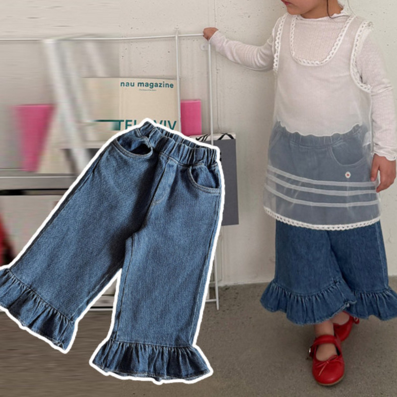 女童荷叶边牛仔裤韩版新品童装26春款女宝甜美洋气百搭直筒长裤