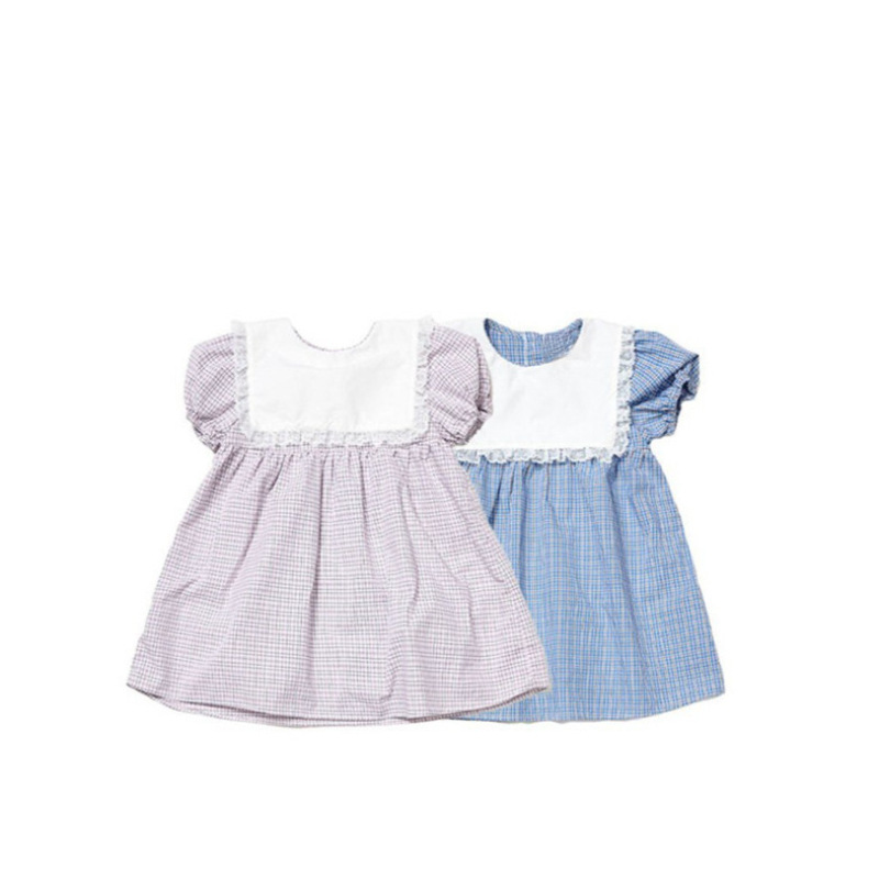 女童花边格纹连衣裙2026夏季新品女宝宝清新撞色泡泡袖韩版A字裙