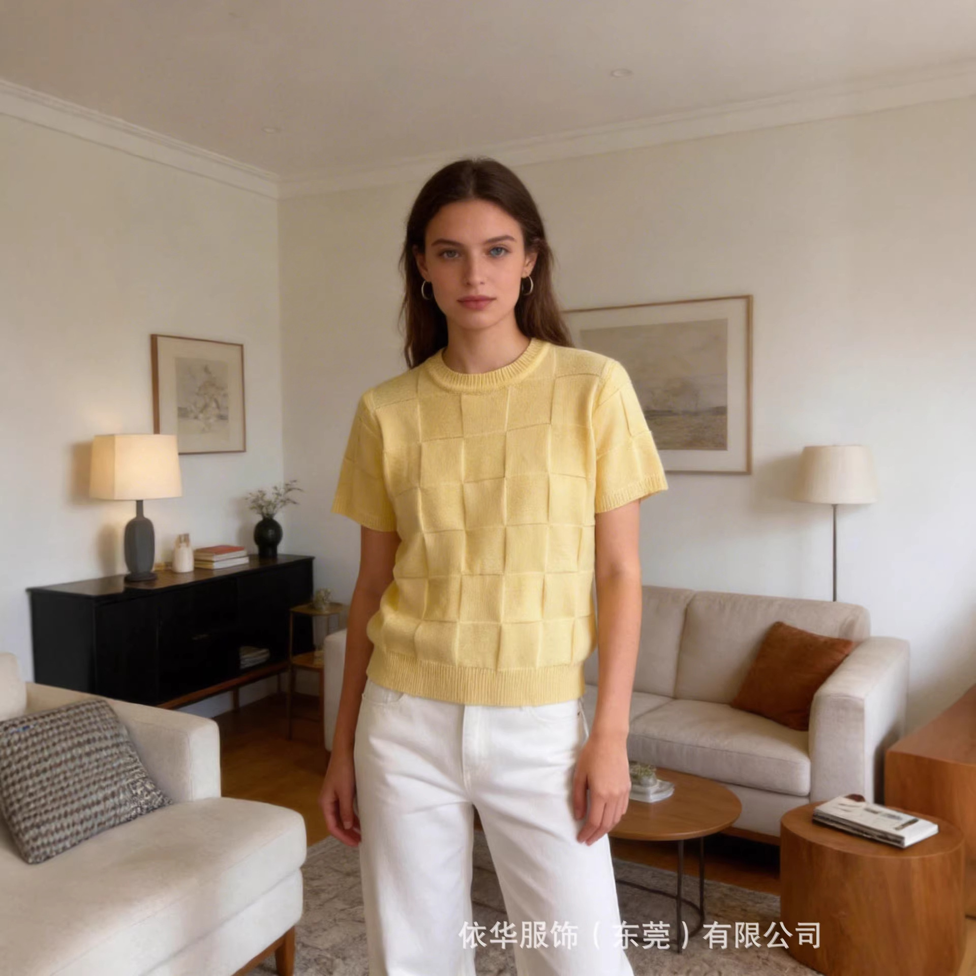 跨境2026新款纯色简约圆领针织短袖时尚方块元素设计针织衫