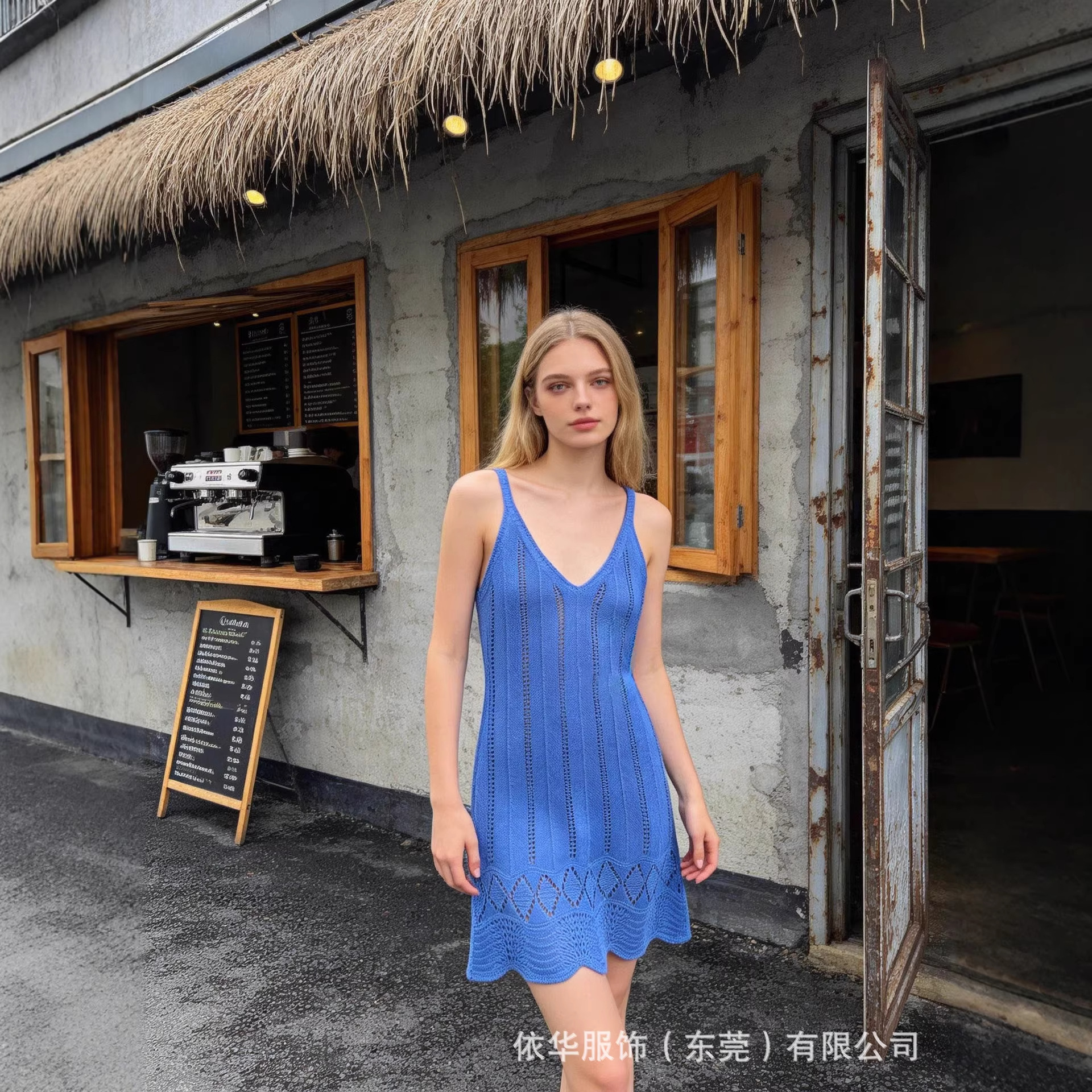 2026亚马逊 夏季新款蓝色针织吊带裙 镂空性感沙滩裙 度假风短裙