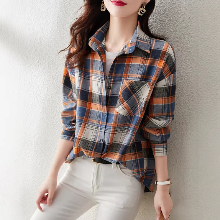 韩版气质格纹设计休闲上衣26春秋新品翻领时尚通勤女式衬衫女