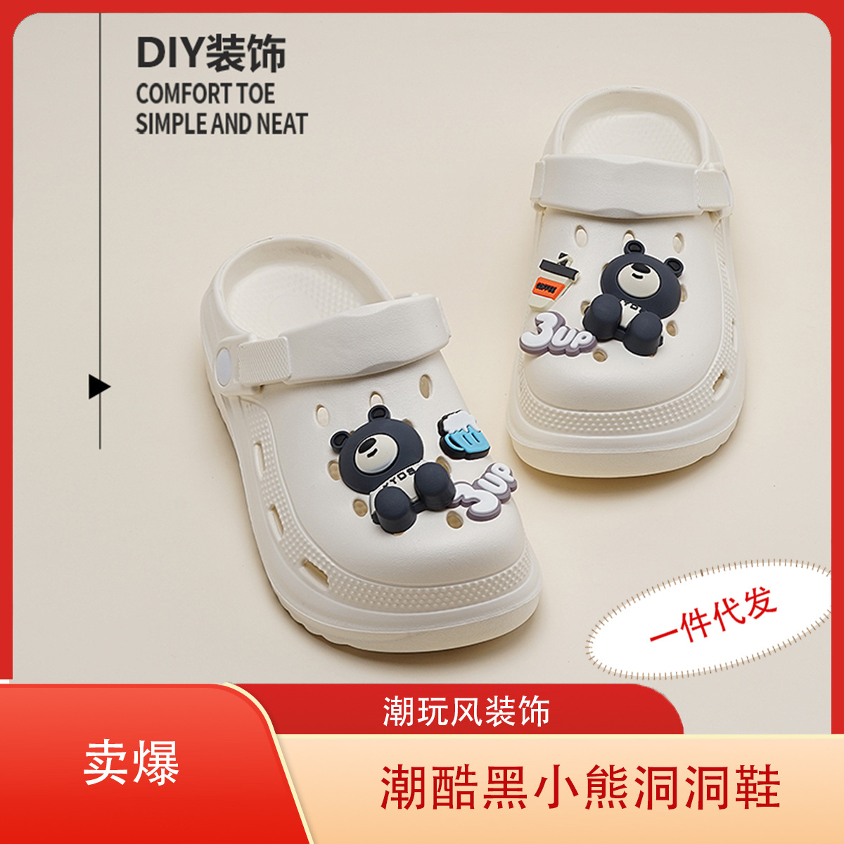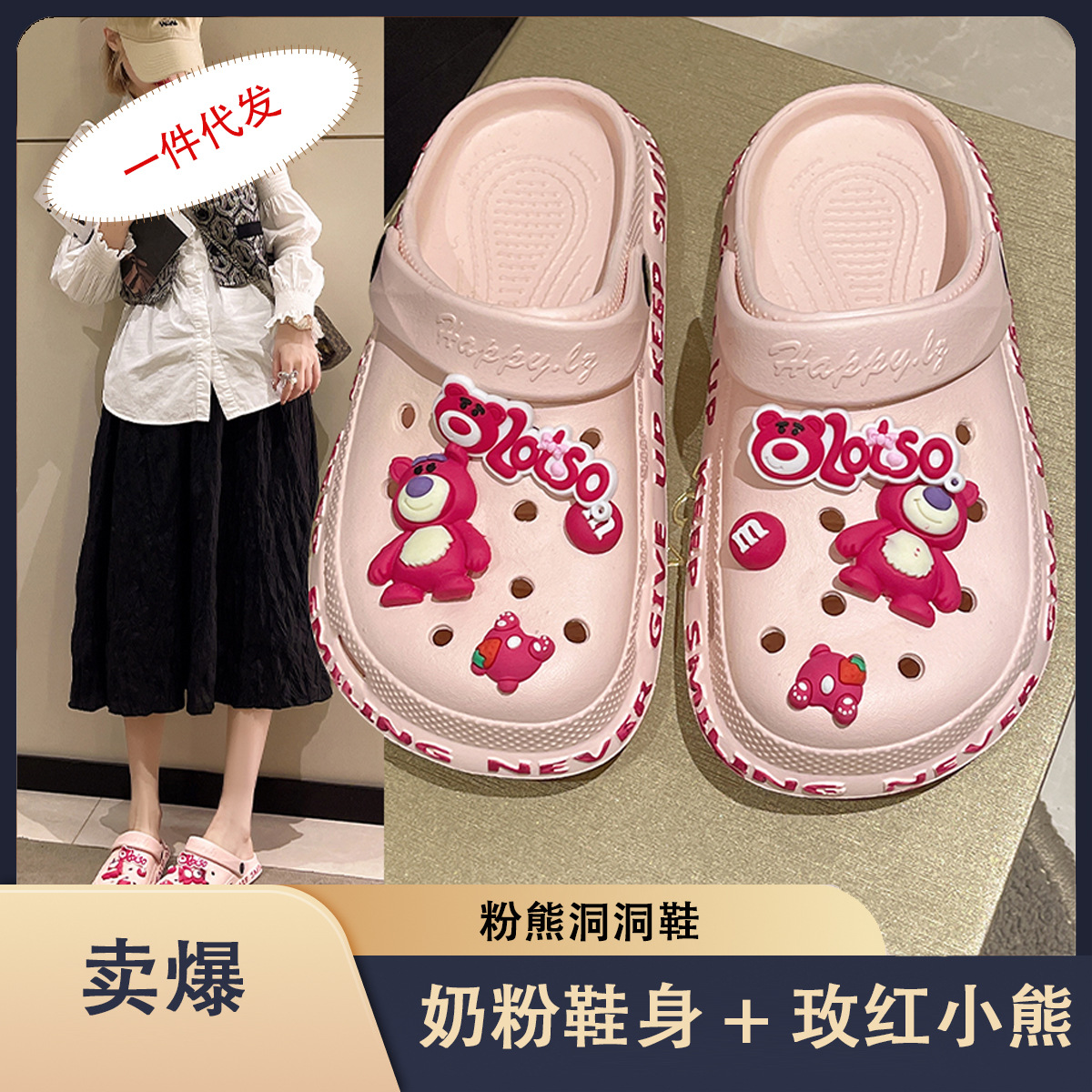 粉系怪趣小熊洞洞鞋女款DIY装饰凉拖 软萌防滑外穿包头拖软弹脚感
