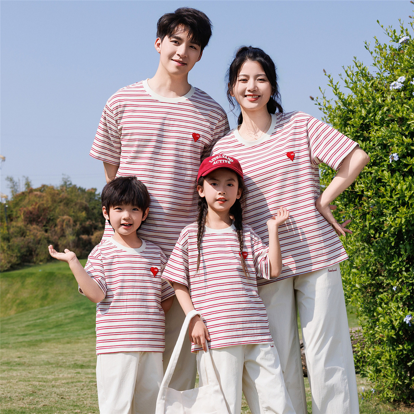 新款亲子装短袖t恤夏季一家三口四口条纹男女童短袖上衣休闲长裤