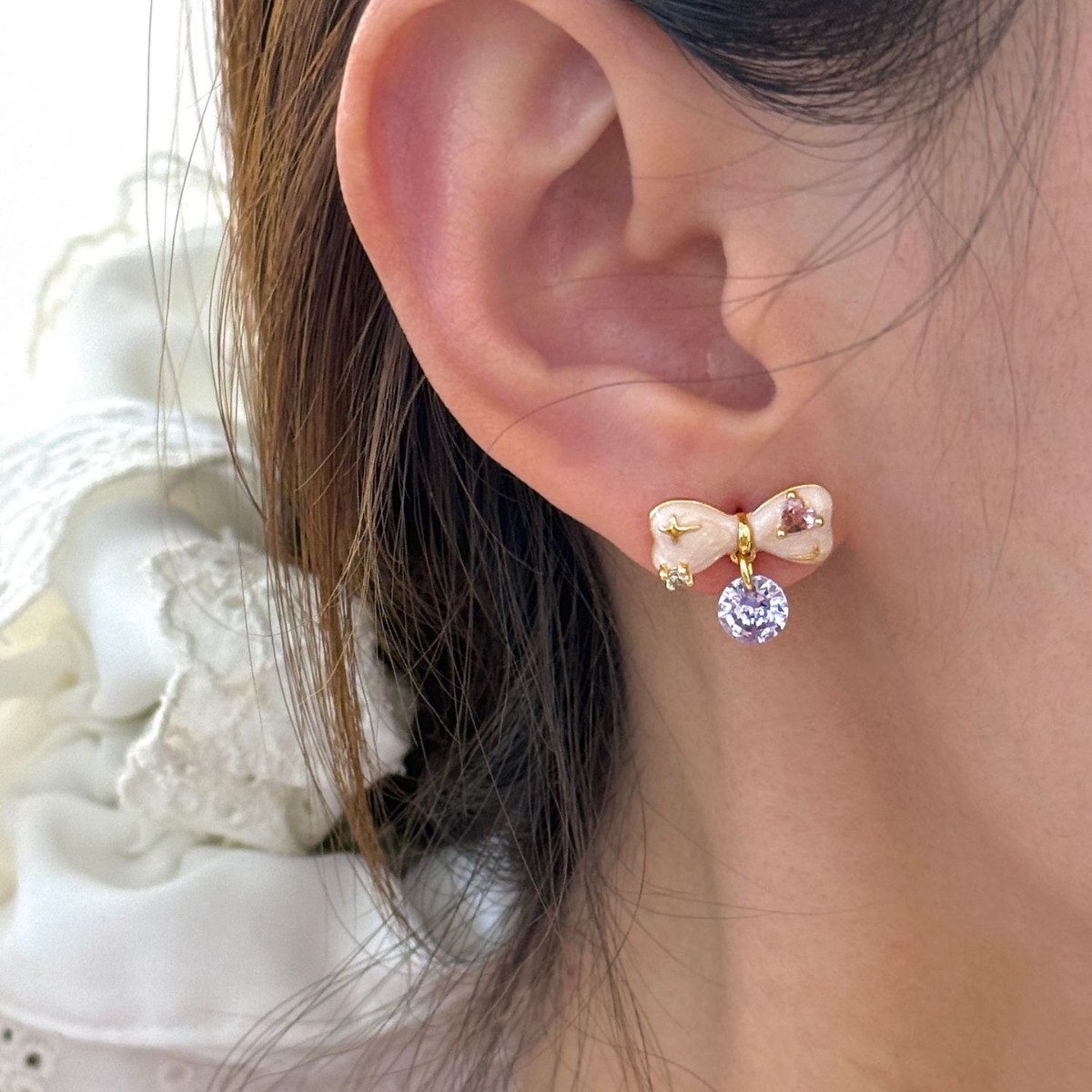 甜美珐琅滴釉淡粉色蝴蝶结淡紫色锆石吊坠耳钉法式浪漫风优雅耳饰