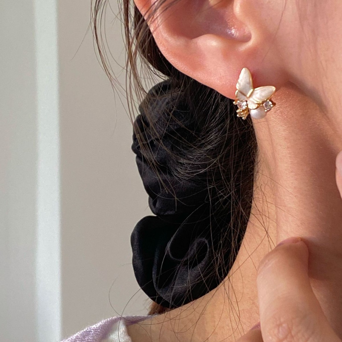 春季清新甜美风天然淡水珍珠珐琅滴釉粉紫蝴蝶耳钉超仙小巧耳饰女
