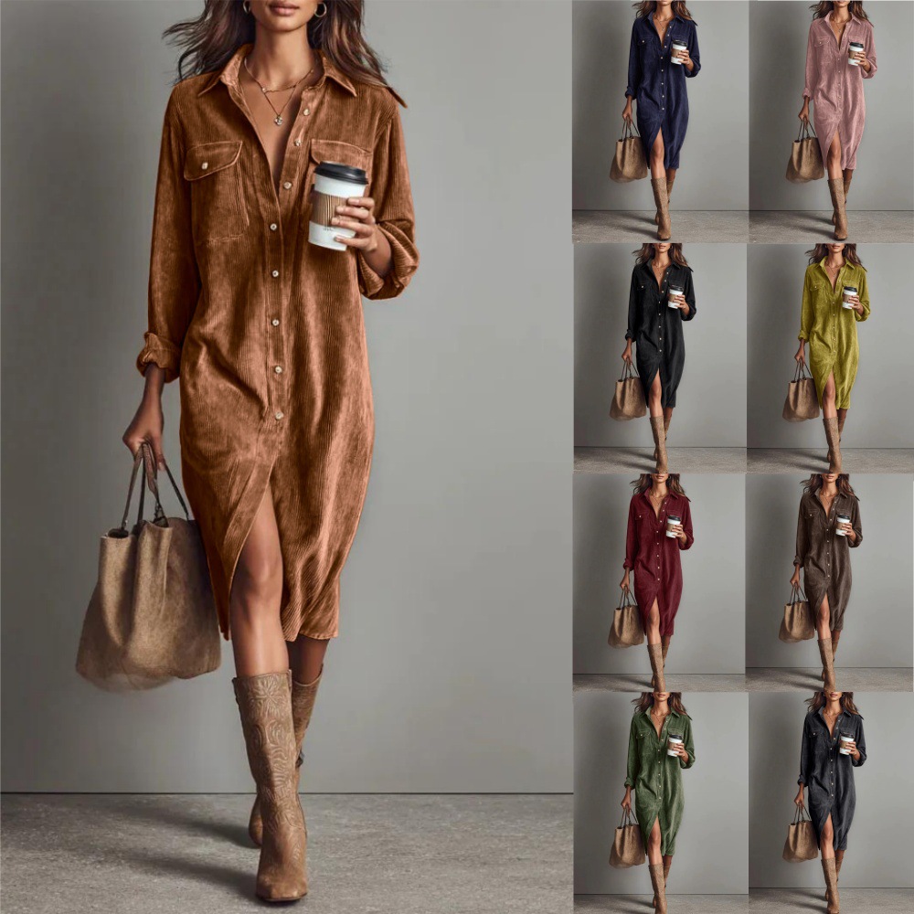 2025新款亚马逊独立站欧美纯色灯芯绒长袖连衣裙翻领衬衣宽松长裙