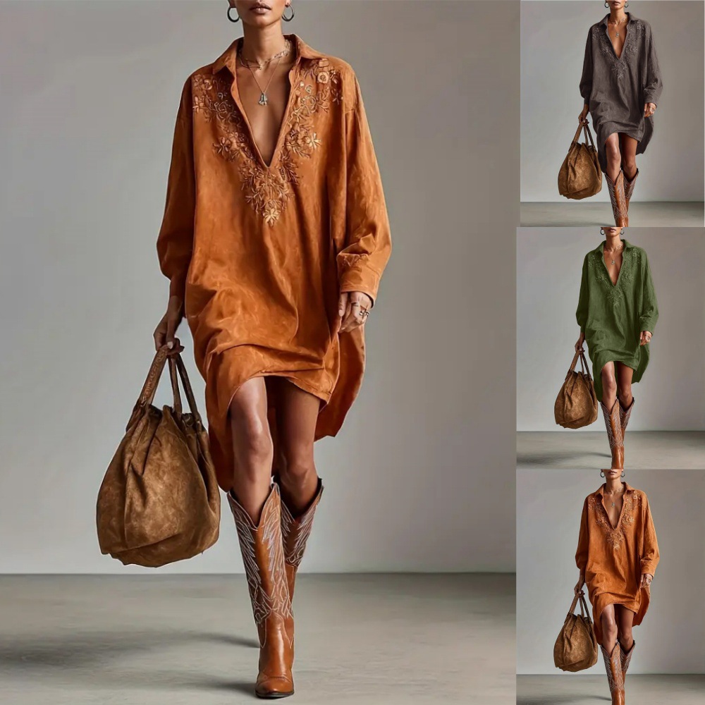 新款重工刺绣欧美跨境长袖衬衫裙子新款休闲宽松衬衣裙仿麂皮绒