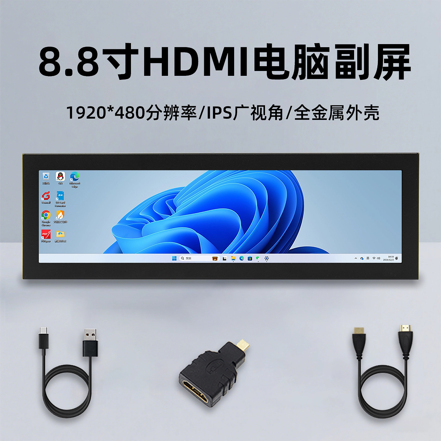 树莓派8.8寸HDMI显示屏IPS长条电脑副屏机箱实时监控显示器AIDA64