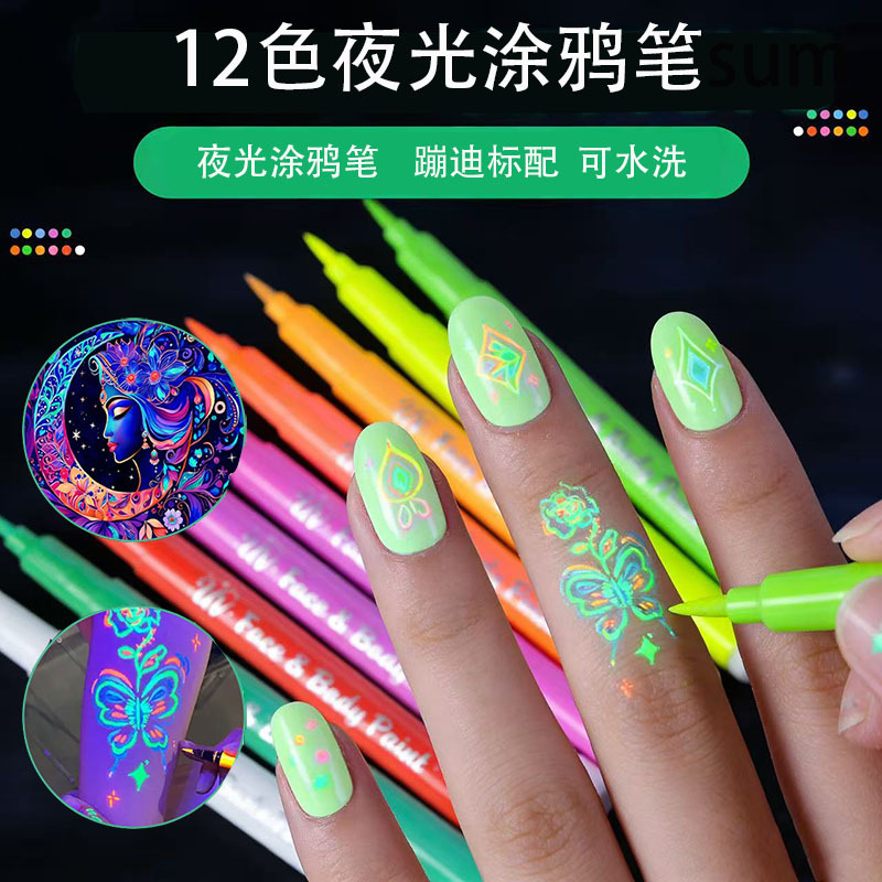 跨境12色荧光涂鸦笔描绘笔DIY彩绘描甲笔 身体彩绘彩绘笔夜光笔