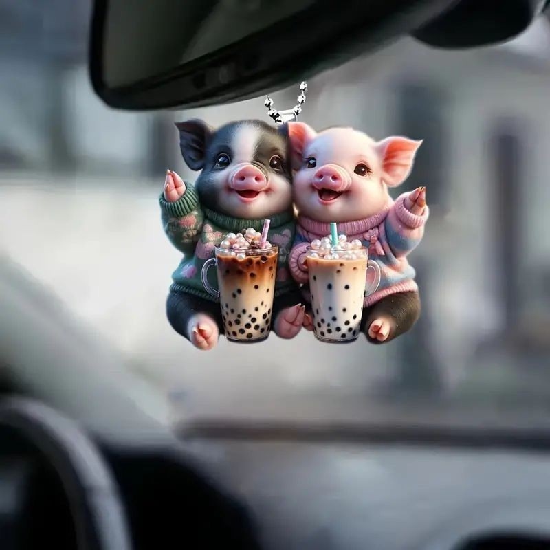 跨境新款亚克力平面向喝奶茶的两只小猪汽车挂件小猪汽车摆件