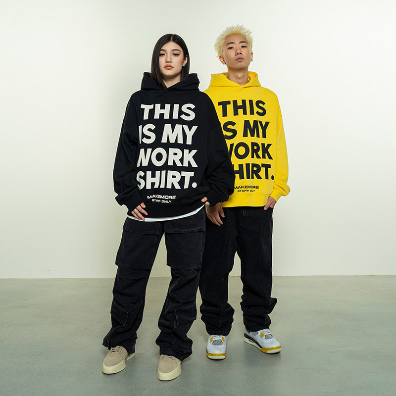 Makemor卫衣男春季WORK黄色美式慵懒休闲情侣黑色长袖连帽上衣女