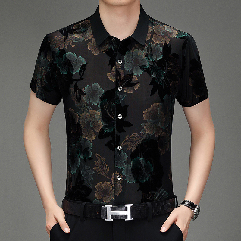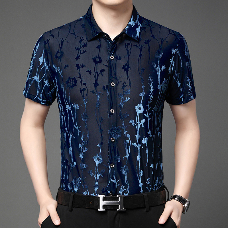 高档短袖提花衬衫男夏天轻薄开衫舞蹈上衣透明性感花衬衣男款复古