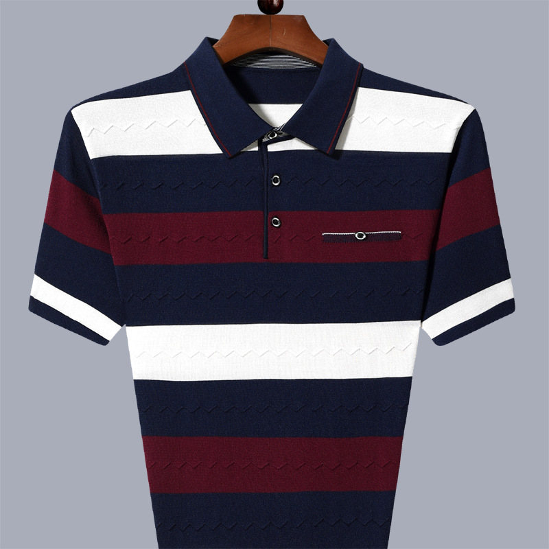 中老年男士短袖条纹t恤有领免烫休闲坠感凉感冰丝翻领T恤男老人夏