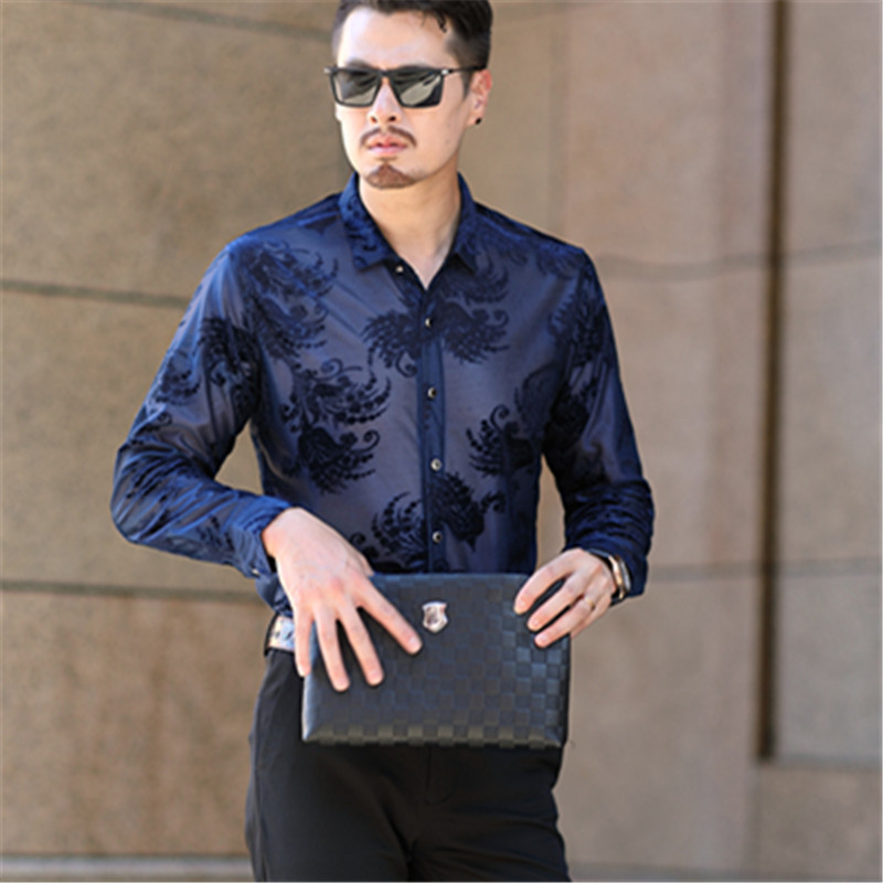 外贸春夏休闲镂空欧美衬衣男款轻薄修身复古提花透明长袖衬衫男士