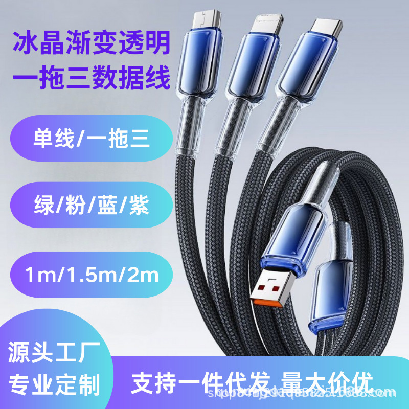 120冰晶数据线一拖三超级快充适用华为苹果安卓三合一手机充电线