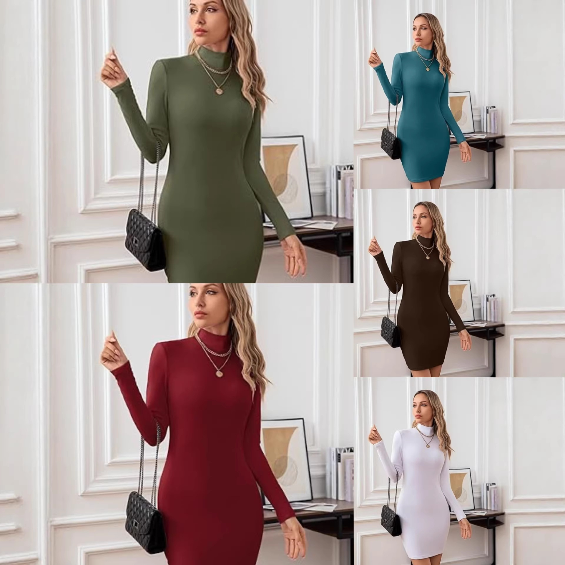 欧美外贸跨境女装亚马逊春秋冬爆品磨毛针织长袖修身高领连衣裙