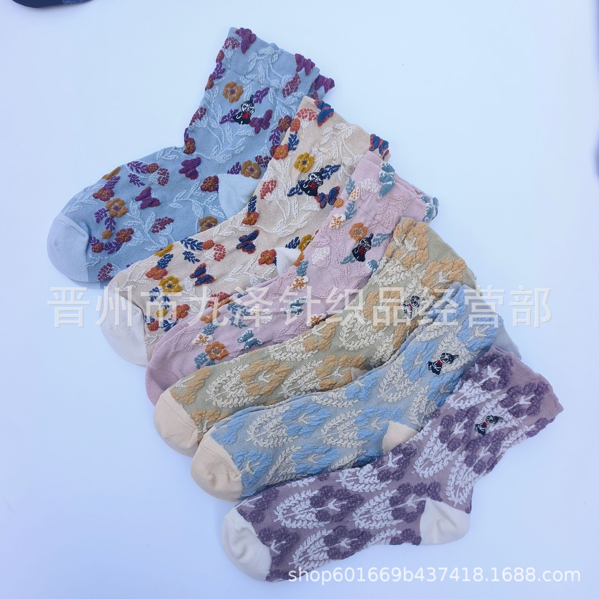 日单时尚百搭亚美女袜森系花卉复古浮雕中筒刺绣卡通松口棉袜批发
