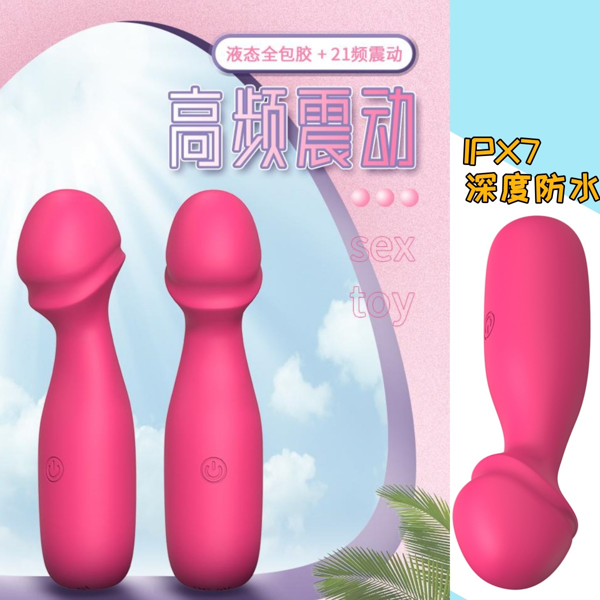 液态硅胶全包胶迷你弯曲阳具头AV震动棒21频震动模式软硅胶自慰器