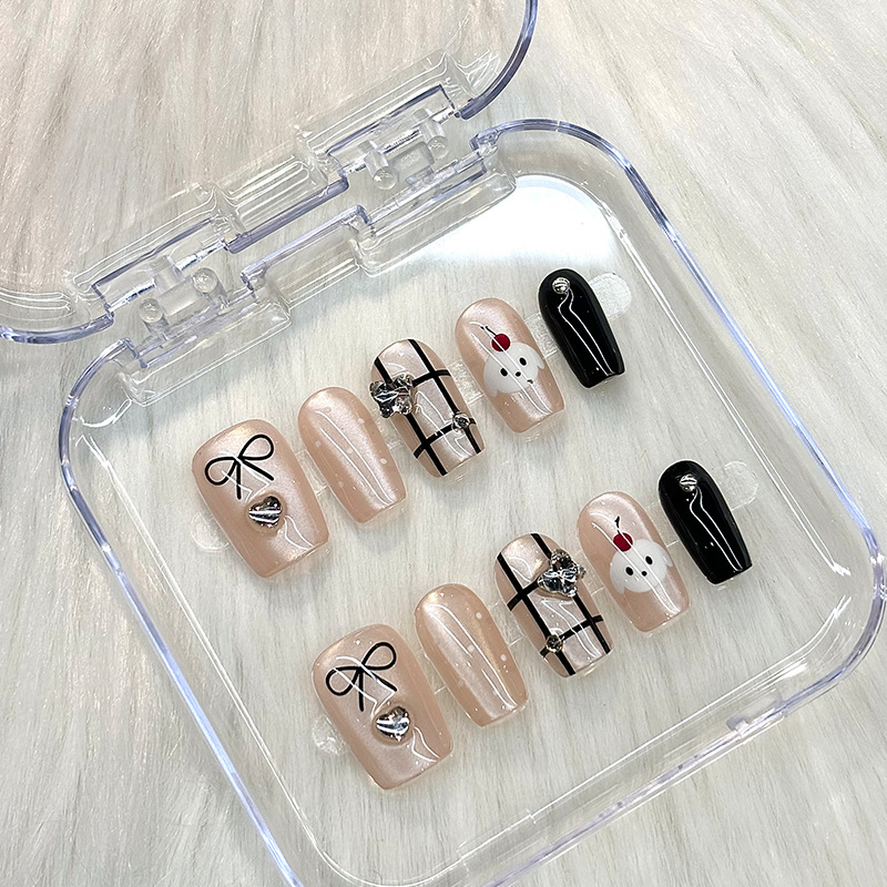 苹果小狗手工穿戴甲高级感格子蝴蝶结短款冰透美甲甲片可拆卸成品