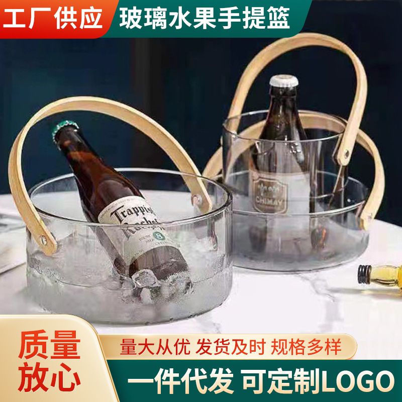 玻璃水果手提篮北欧高硼硅竹木手提大号零食干果盘收纳篮创意冰桶
