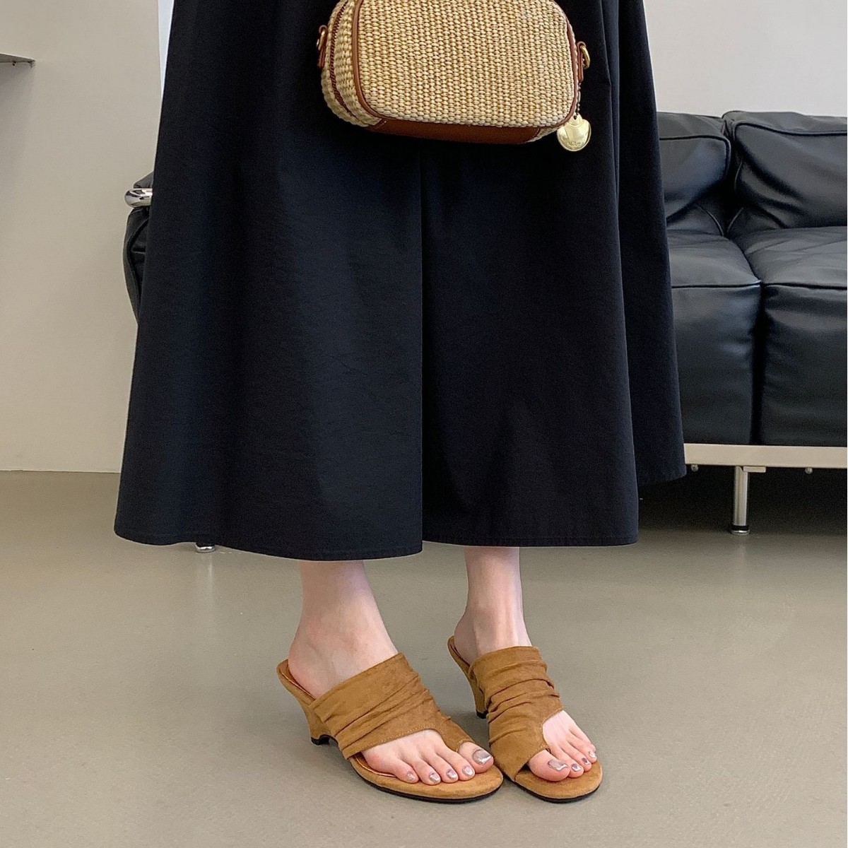 新款韩版夹趾细跟高跟外穿拖鞋女羊皮通勤方头人字拖简约工作凉鞋