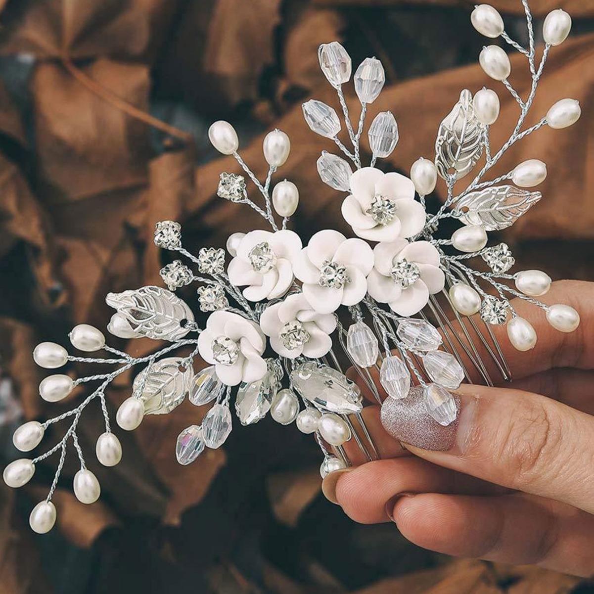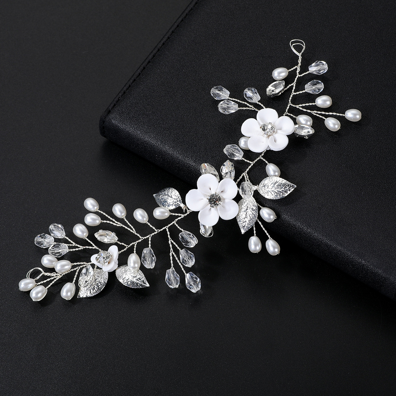 亚马逊跨境欧美专供 白色软陶花朵镶钻手工珍珠发梳侧梳婚礼头饰