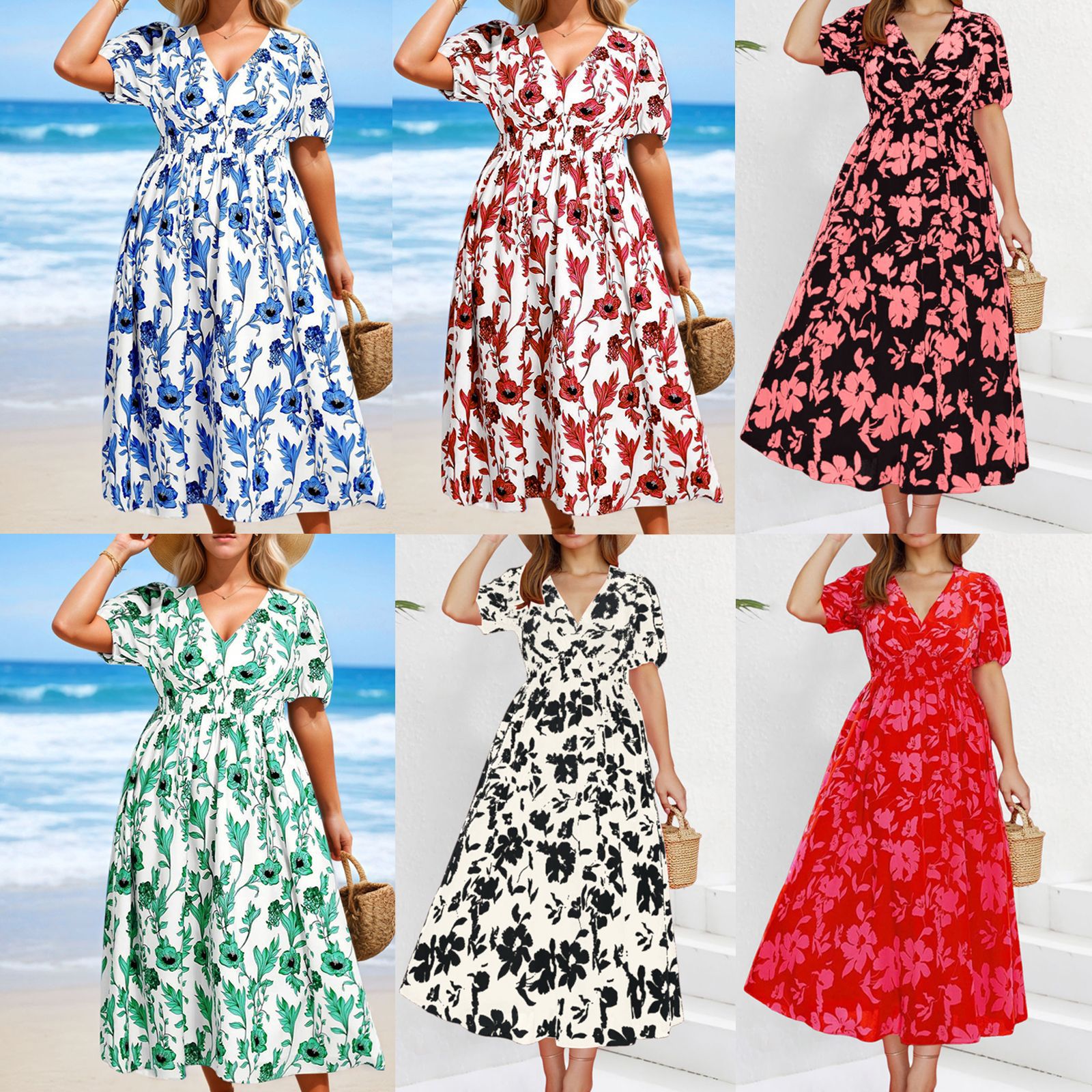 欧美女士大码休闲收腰灯笼短袖连衣裙波西米亚V领宽松小碎花裙子
