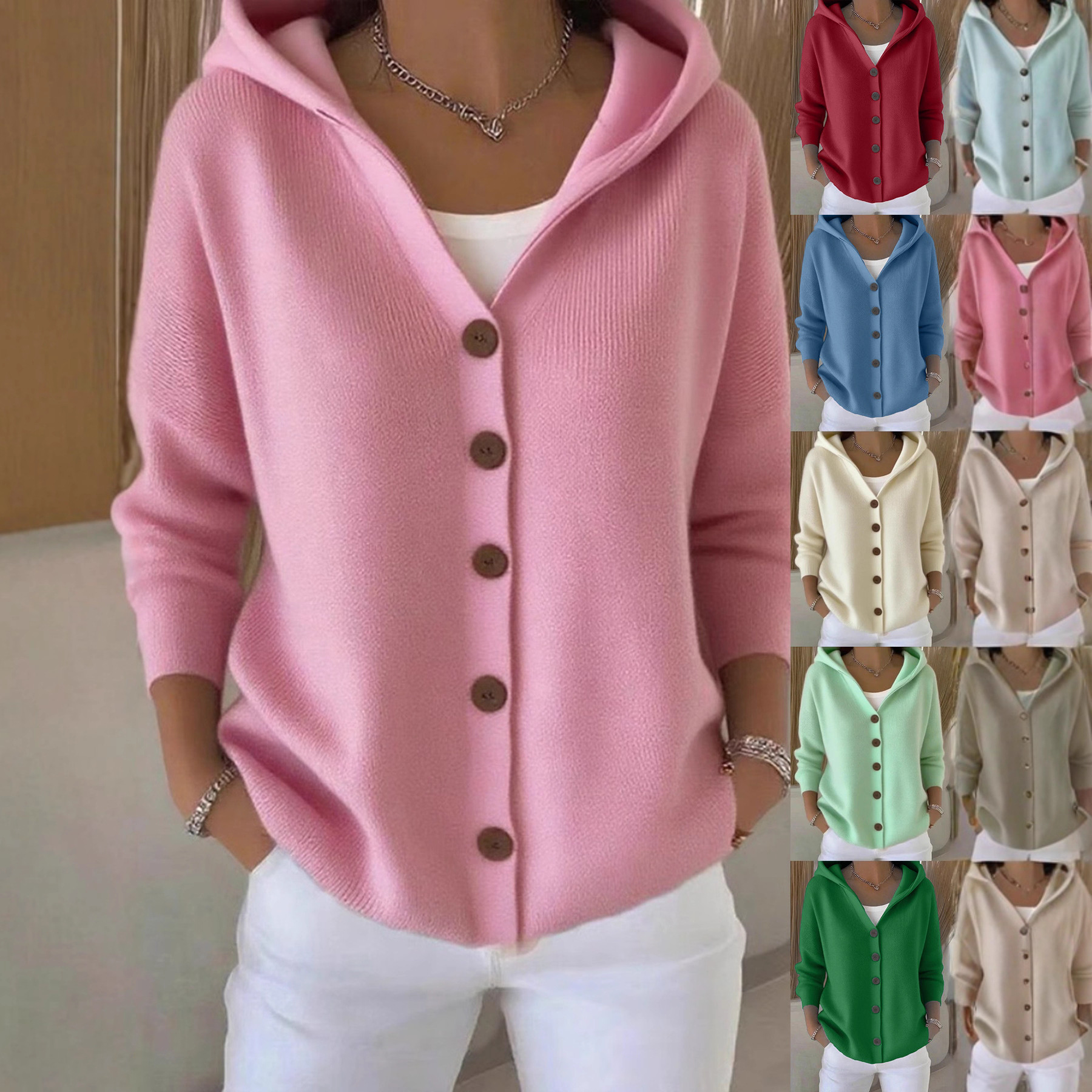 2026跨境欧美风秋冬季新款连帽针织开衫女纯色休闲时尚毛衣外套女