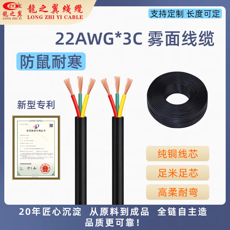专利防鼠咬耐寒 PVC线 22AWG*3C高柔3芯线缆工业级黑色雾面电源线
