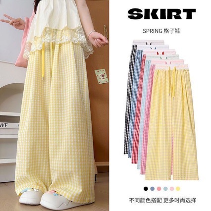 黄色多巴胺格子裤女士夏季休闲宽松慵懒风女裤薄款高腰冰丝阔腿裤